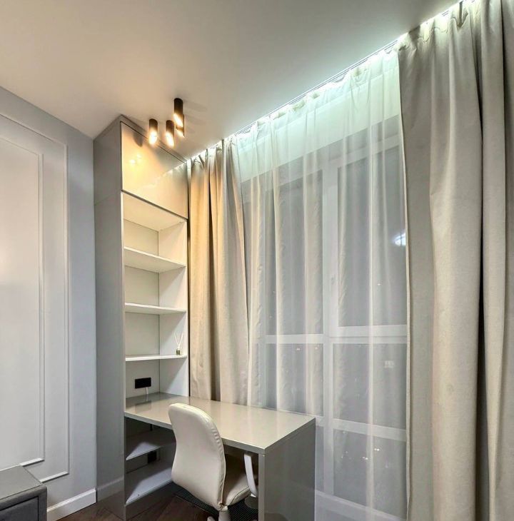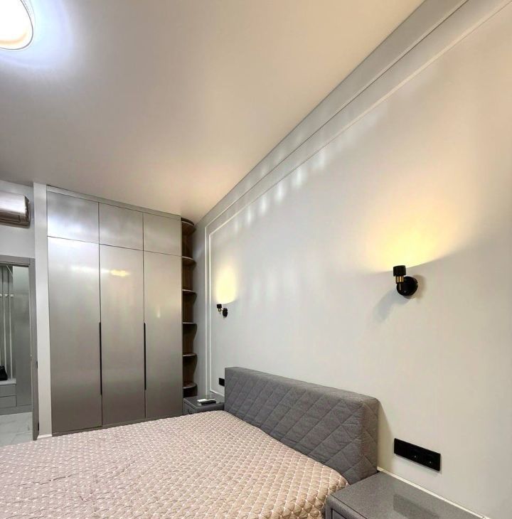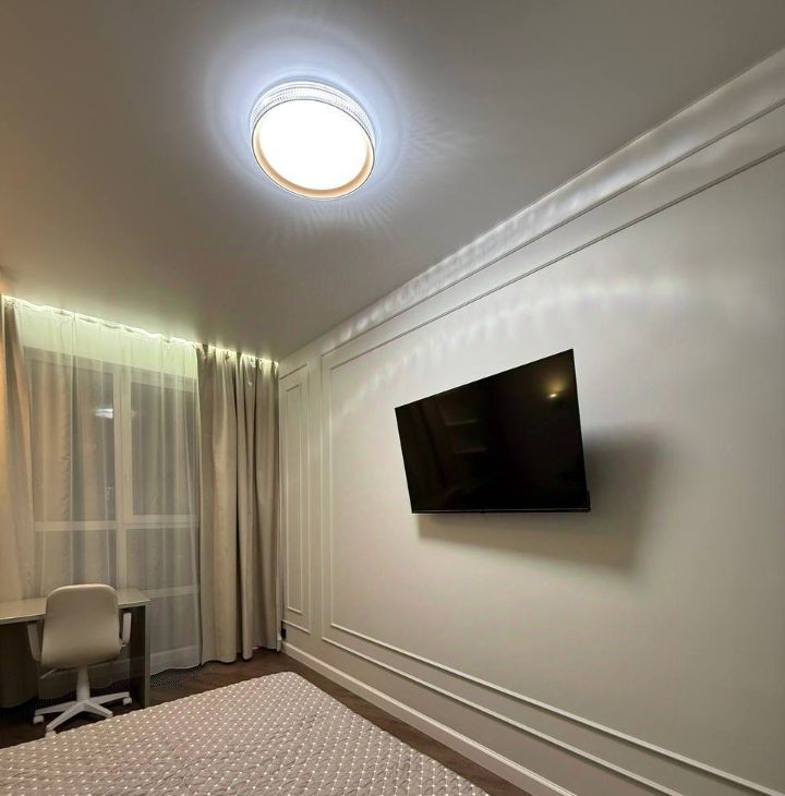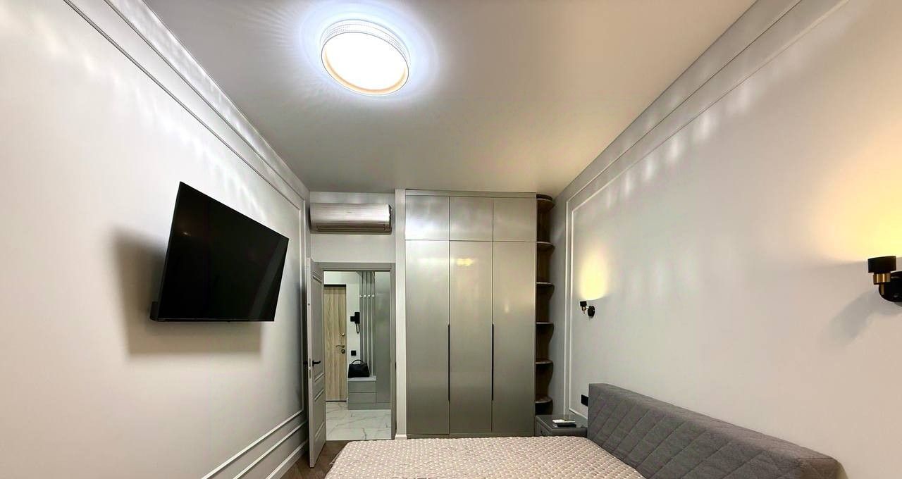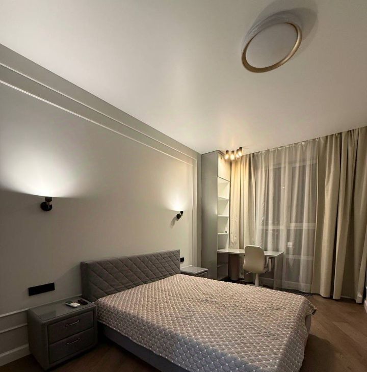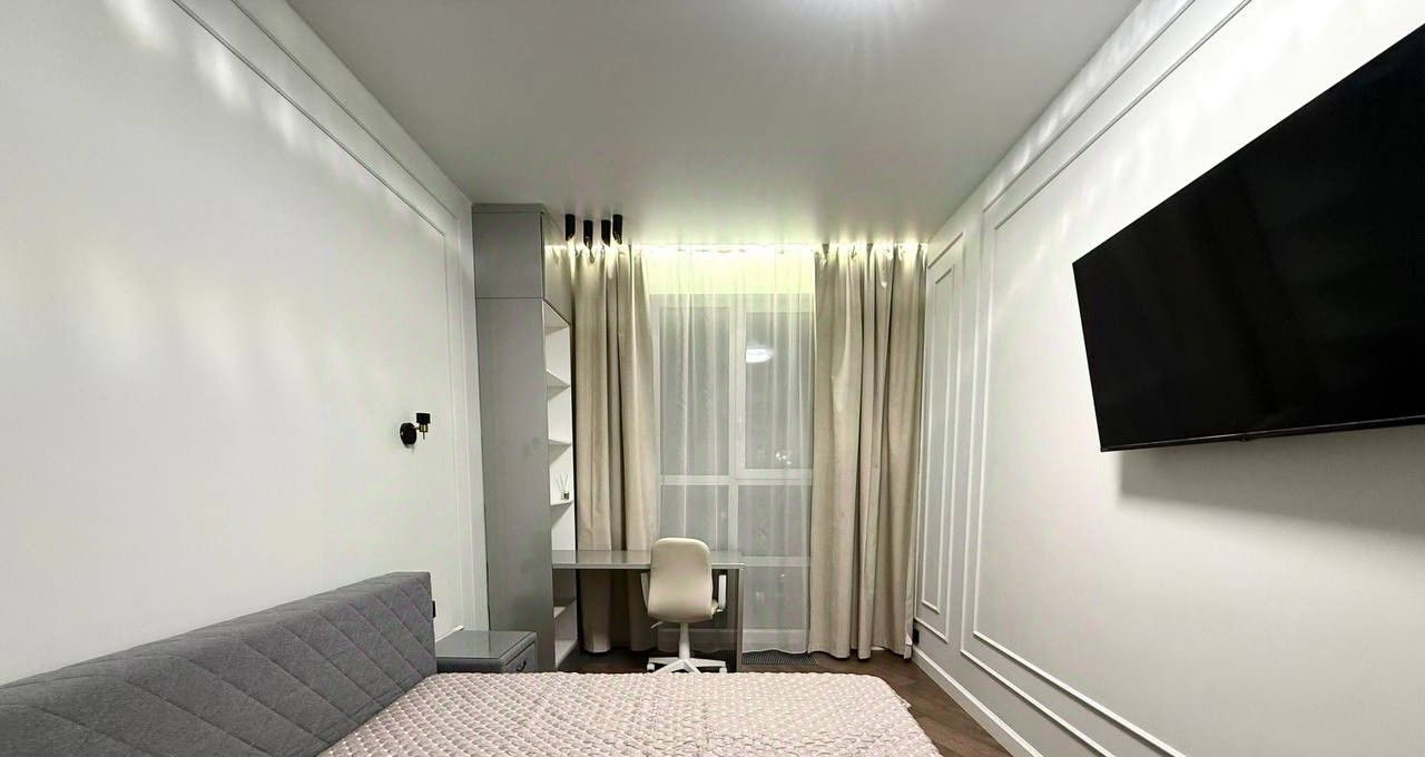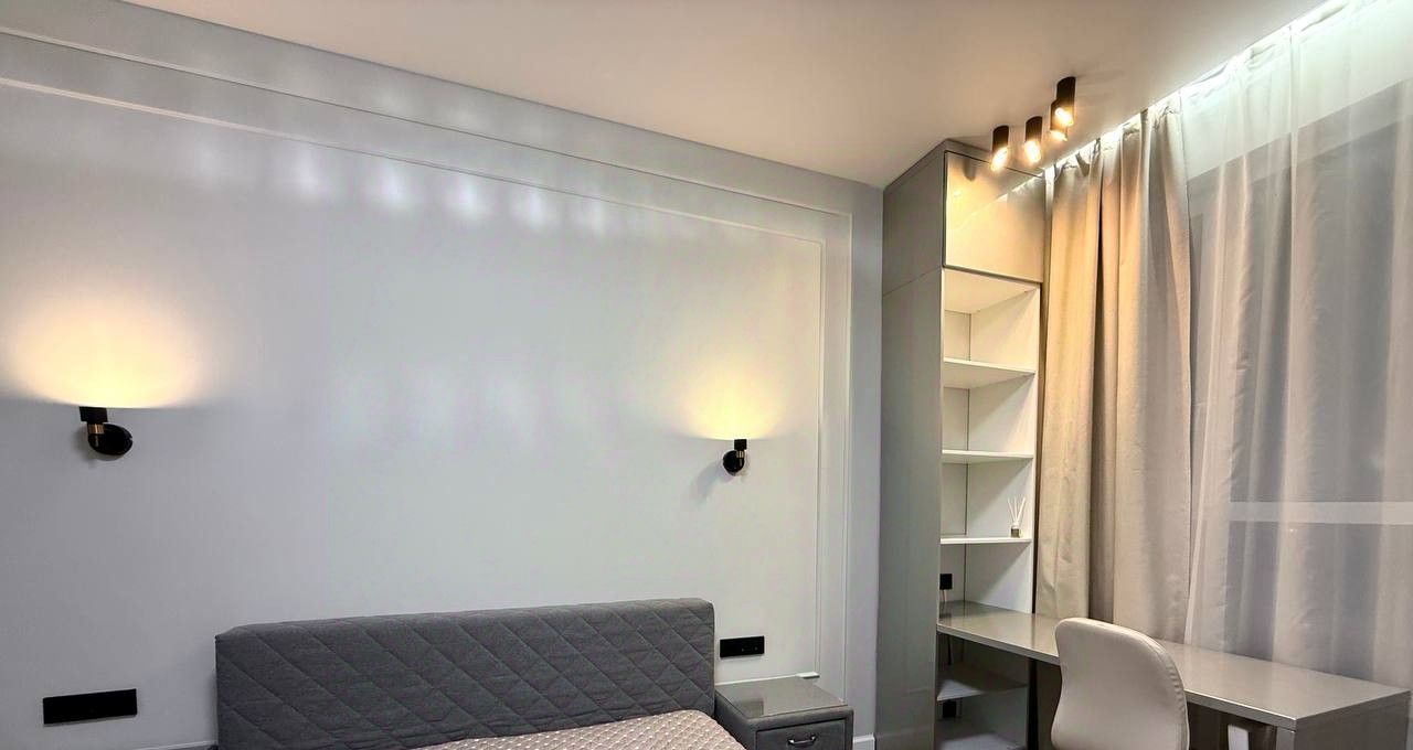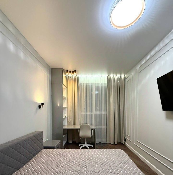 В спальне кровать с ортопедическим матрасом, оборудована зона с рабочим местом, вместительный шкаф, много места для хранения вещей! Напротив установлен телевизор.