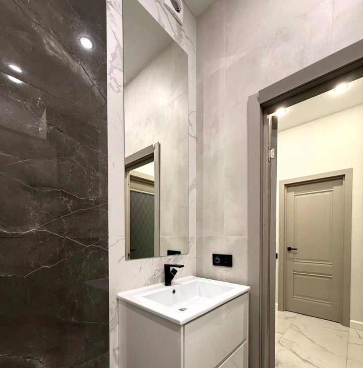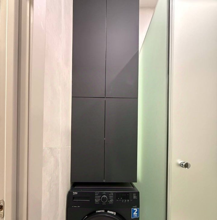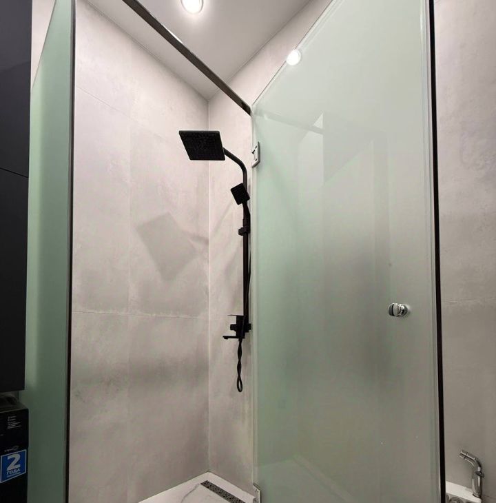 Совмещенный санузел с закрытой душевой кабиной, установлена стиральная машина, современная подсветка, полотенцесушитель, гигиенический душ, теплый пол.