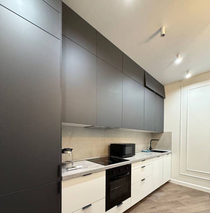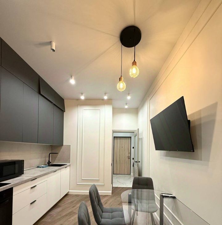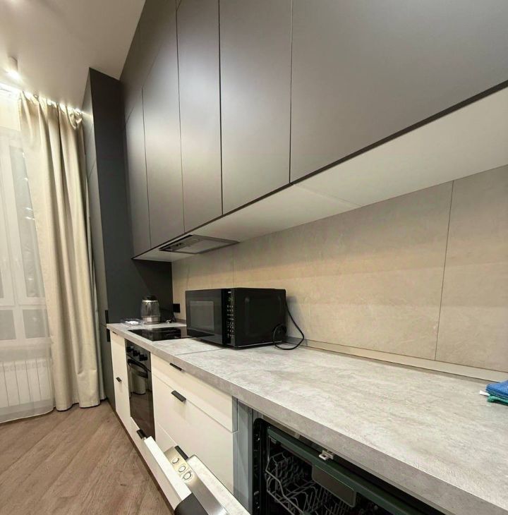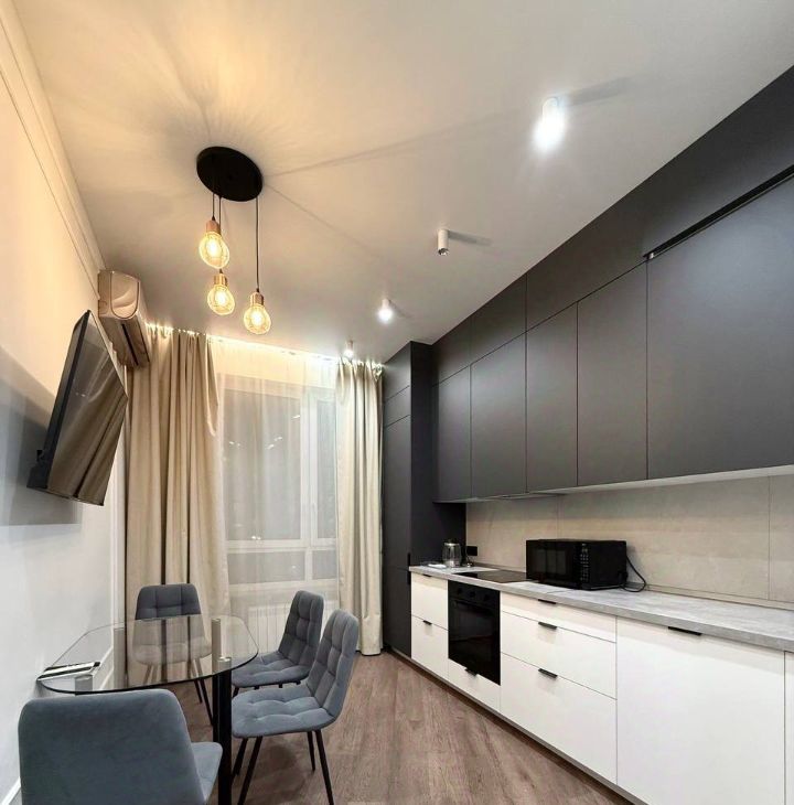 В кухонной зоне установлена качественная бытовая техника. Укомплектована индукционной плитой, установлен холодильник, вытяжка, духовой шкаф, микроволновка, посудомоечная машина, чайник, вместительные шкафчики. Широкоугольный смарт-телевизор для уютного времяпрепровождения!