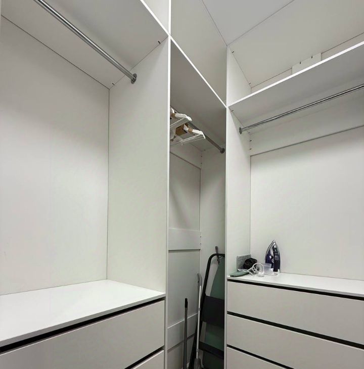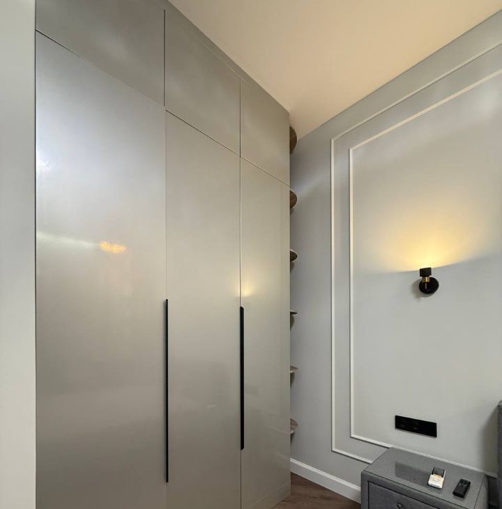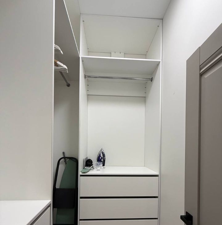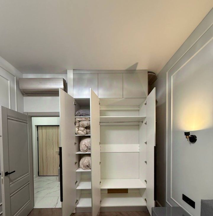 При входе вместительный шкаф с полками. Есть отдельная гардеробная.