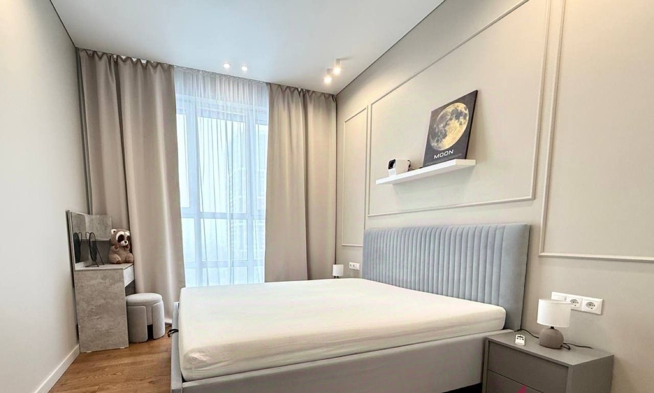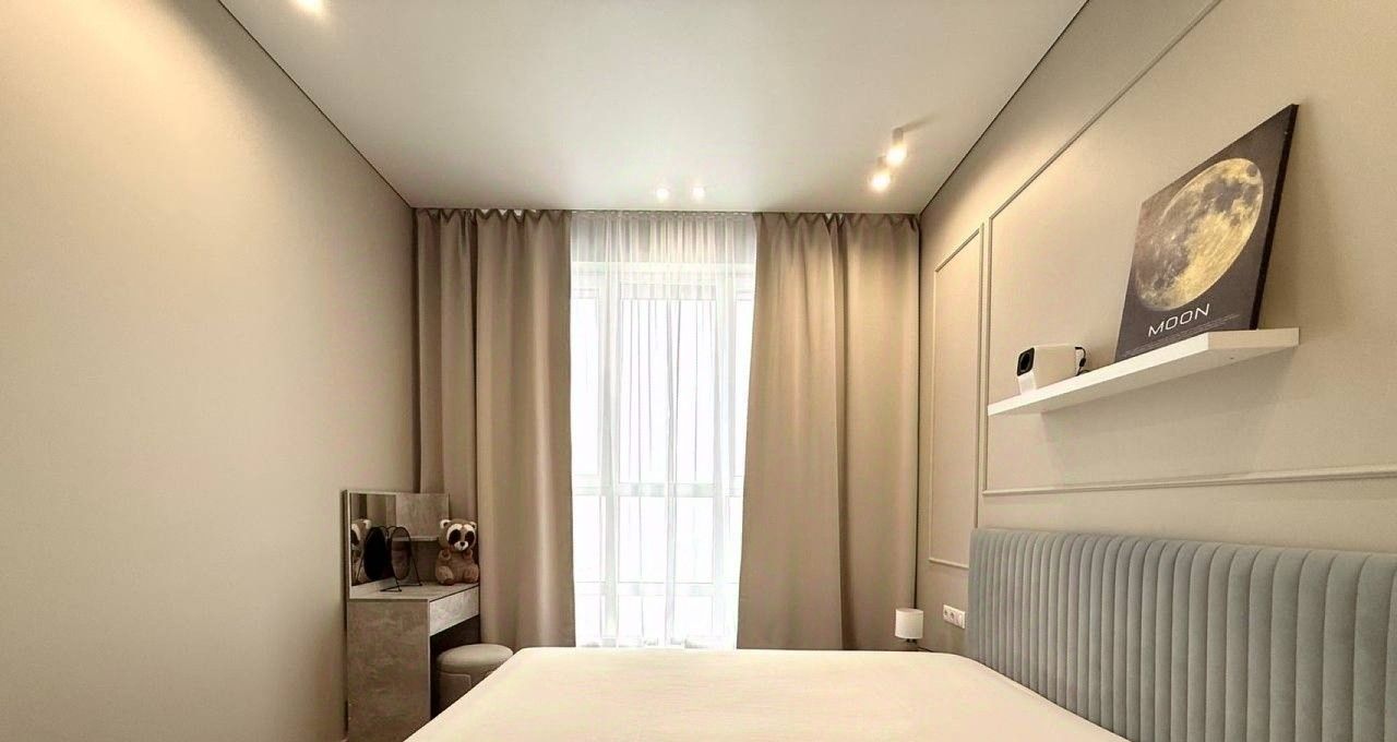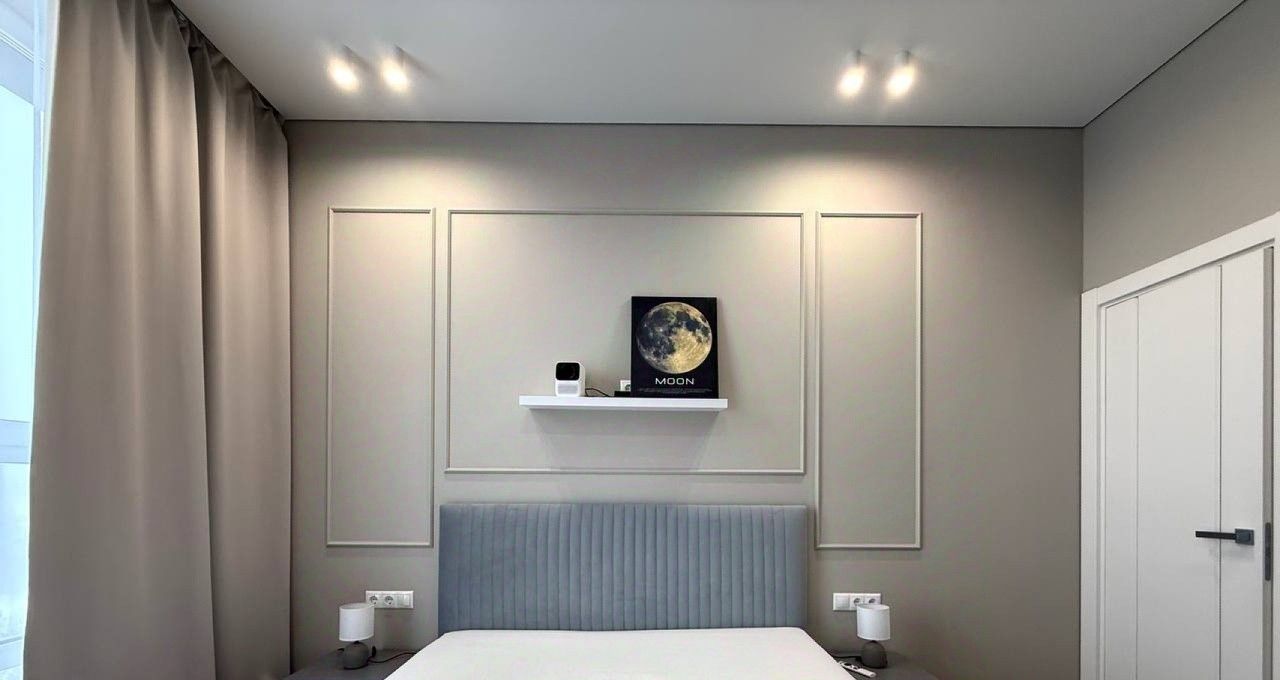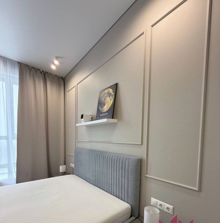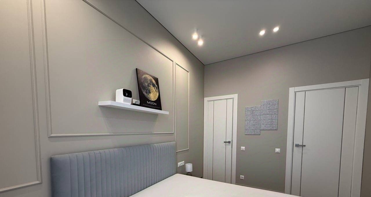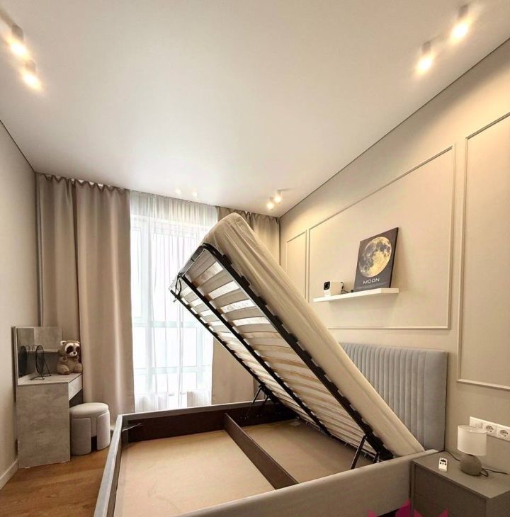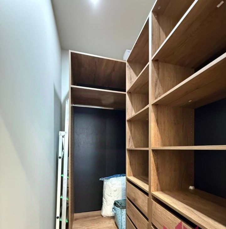 В мастер-спальне кровать с ортопедическим матрасом, вместительная гардеробная с подсветкой, много места для хранения вещей!