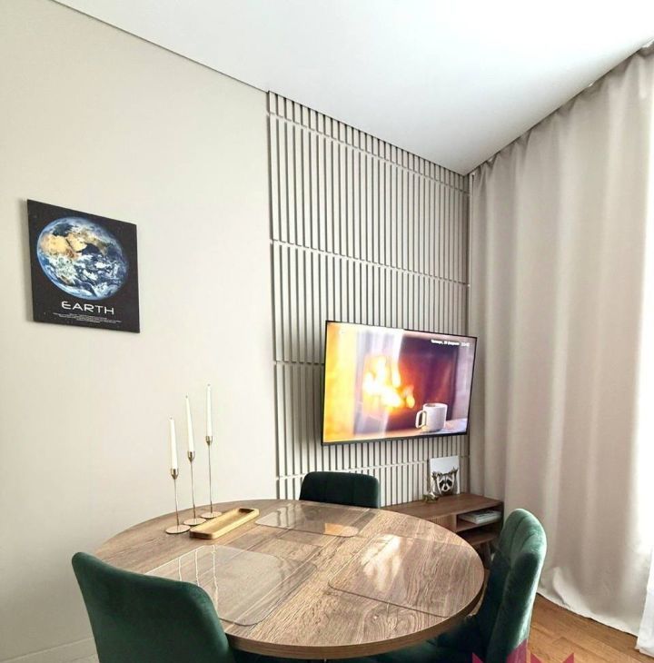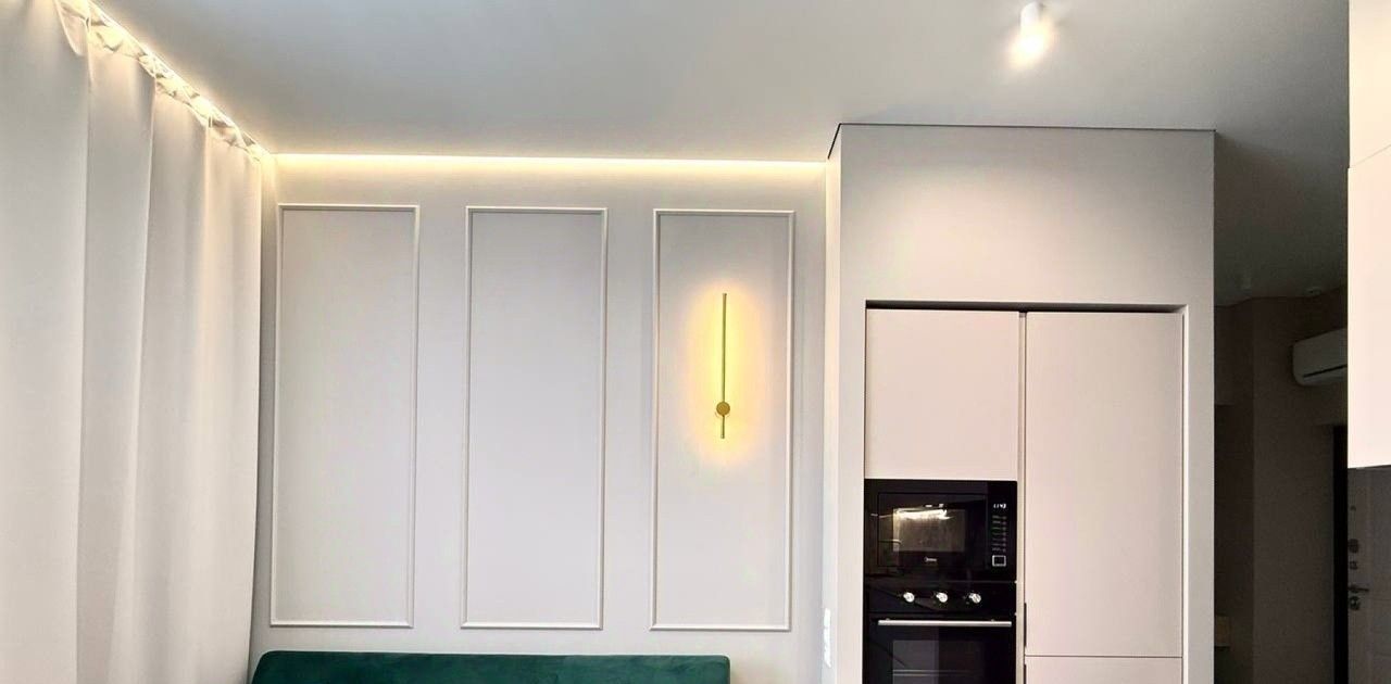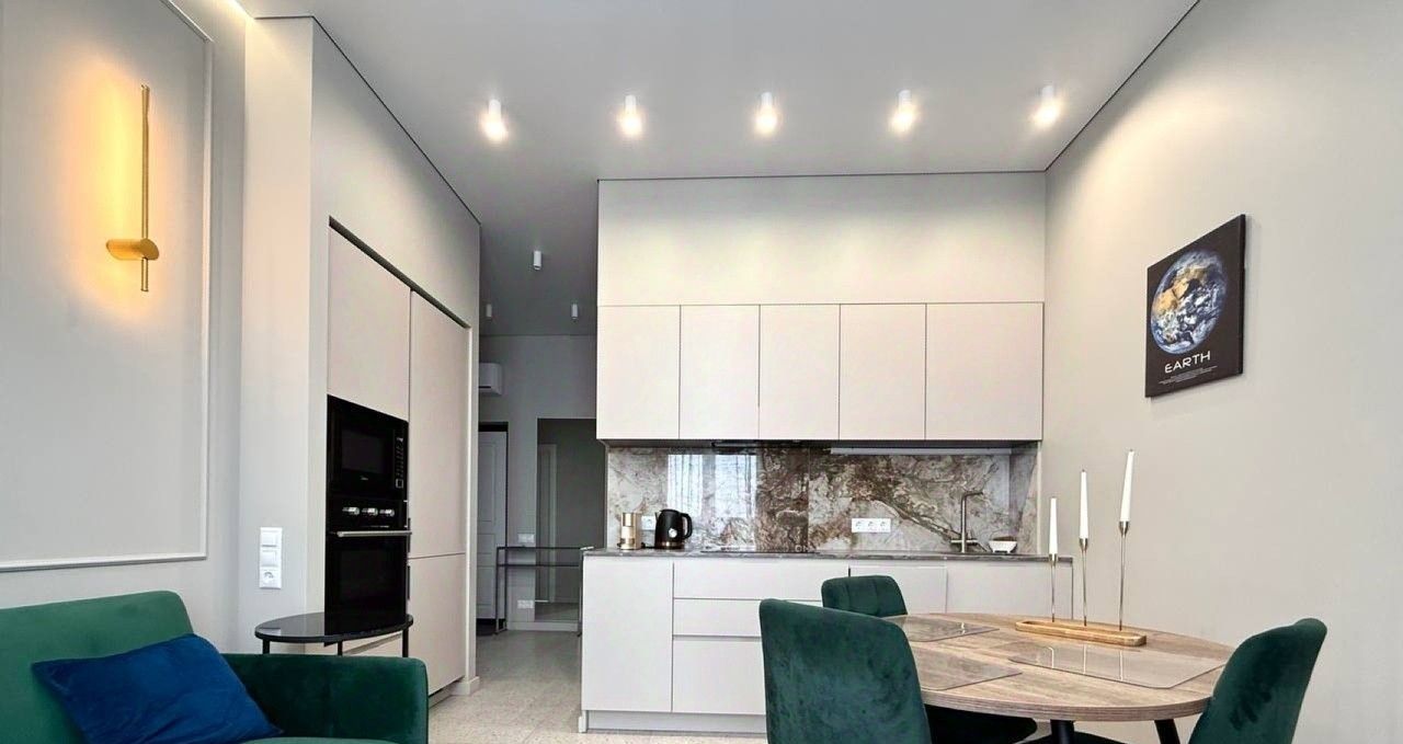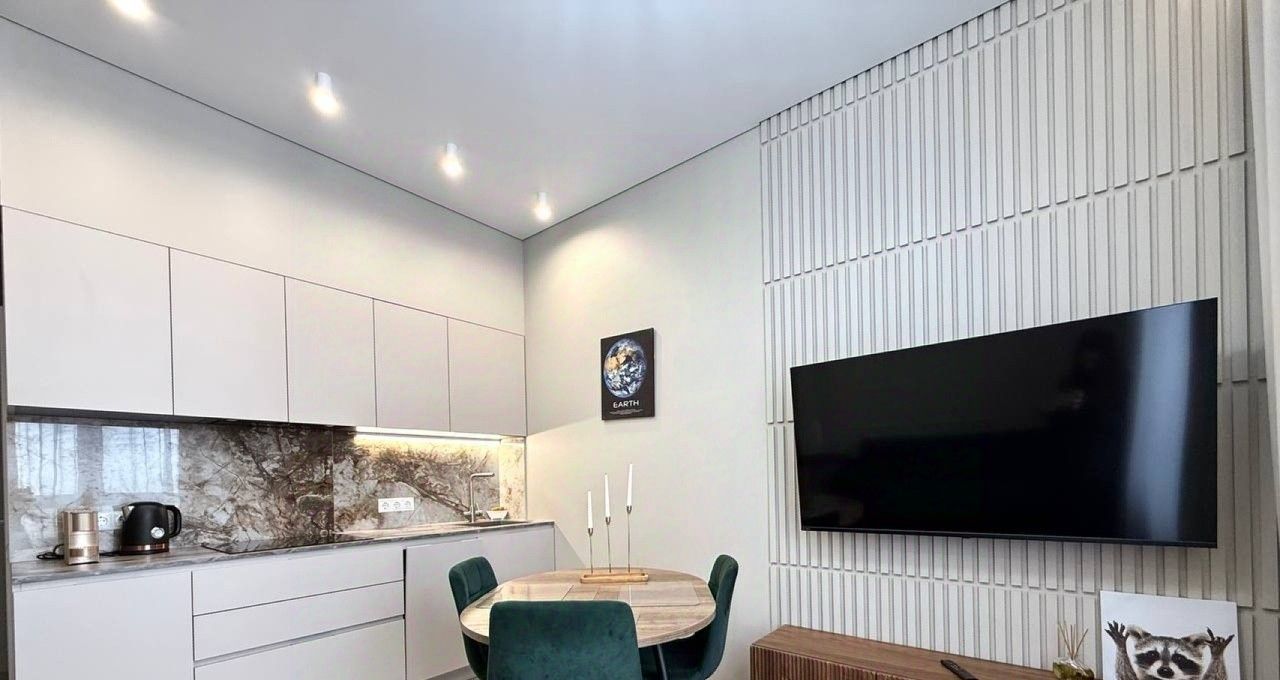 Укомплектована индукционной плитой, установлен холодильник, вытяжка, микроволновка, посудомоечная машина, чайник, вместительные шкафчики, куплена новая посуда, есть фильтр для воды. Раскладывающийся диван, широкоугольный смарт-телевизор для уютного времяпрепровождения!