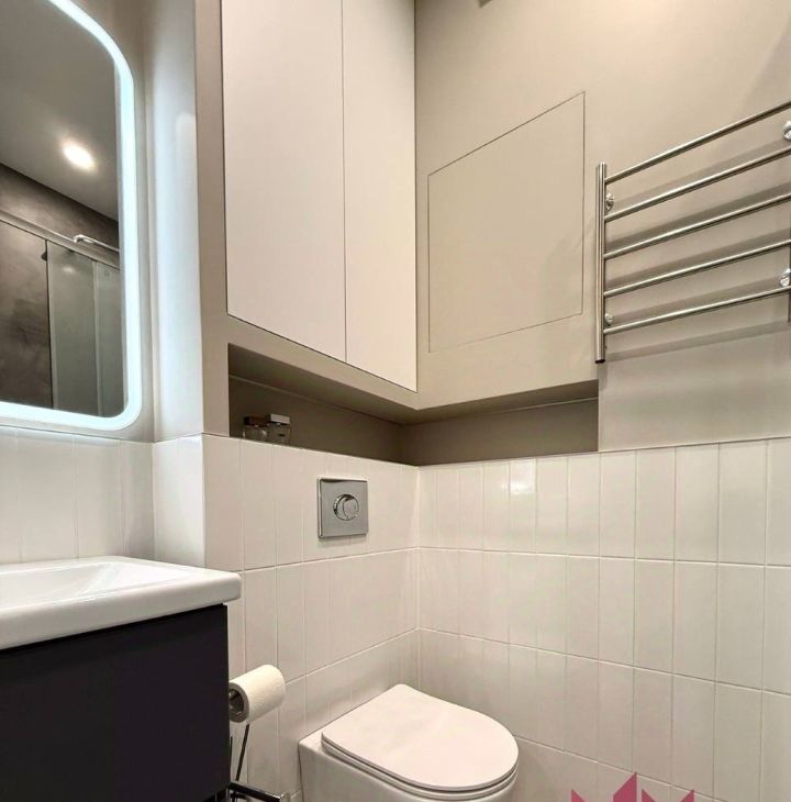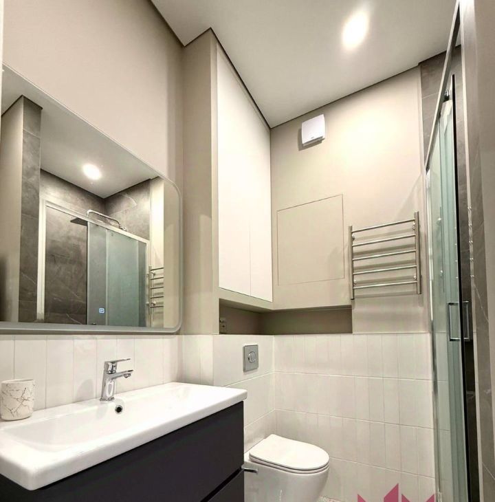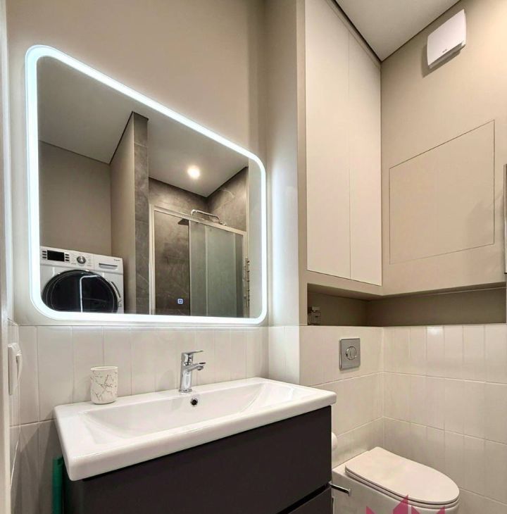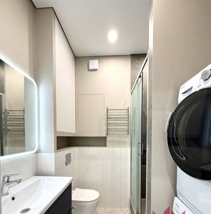 Совмещенный санузел с закрытой душевой кабиной, установлена стиральная и сушильная машина, современная подсветка, полотенцесушитель, гигиенический душ, водонагреватель, система Нептун.