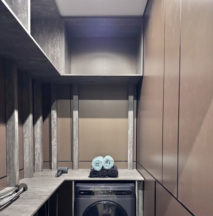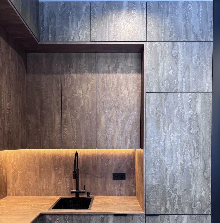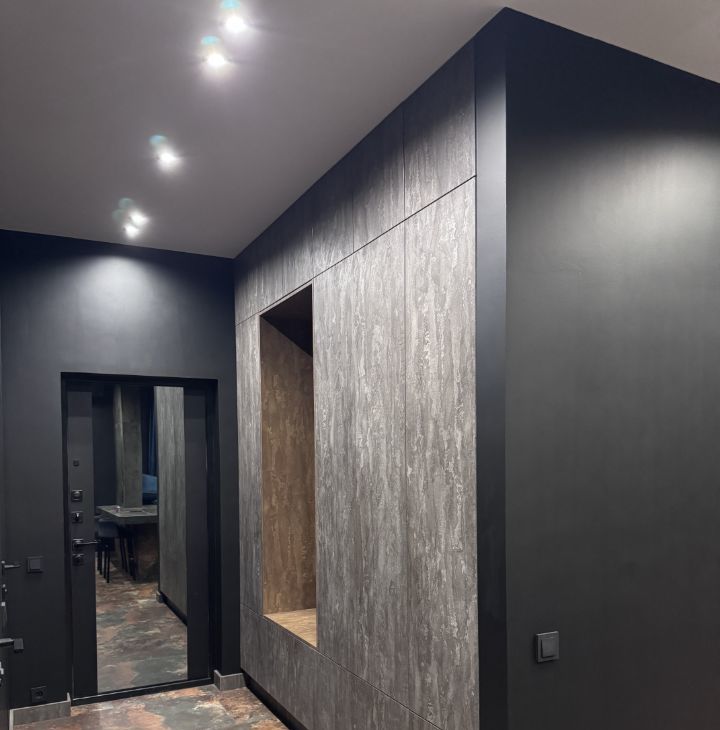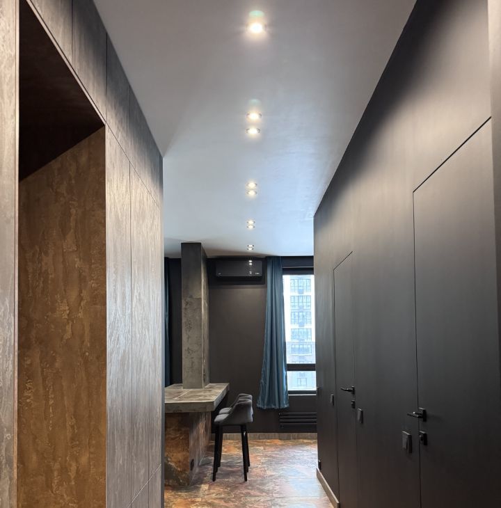 В квартире выполнен дизайнерский ремонт в темных тонах, установлена новая бытовая техника. Телевизор, стиральная машина с сушкой, холодильник, посудомоечная машина, духовой шкаф, микроволновая печь, и варочная панель с вытяжкой.