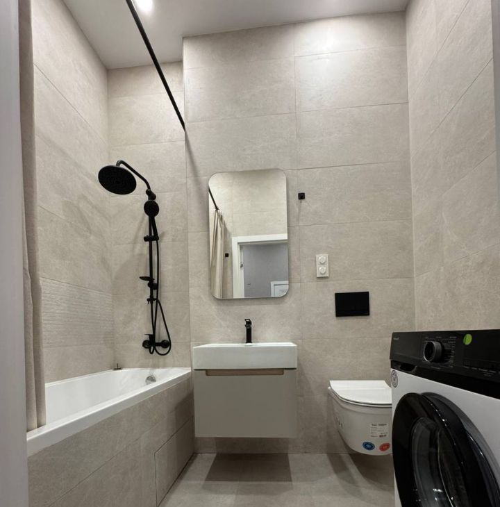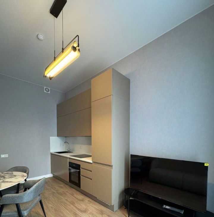 Новая техника: ТВ 50 дюймов, посудомоечная машина, духовой шкаф, варочная панель, холодильник, вытяжка, стиральная машина.