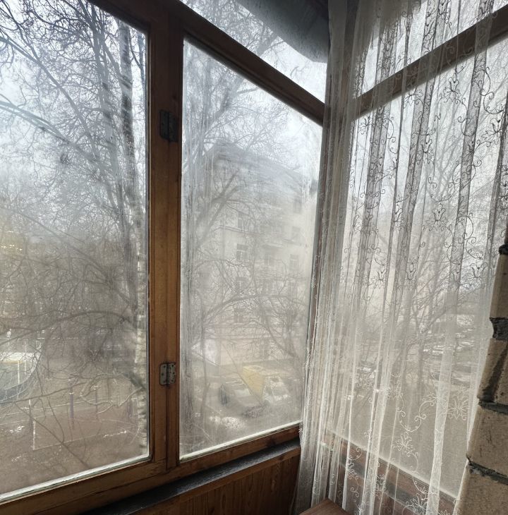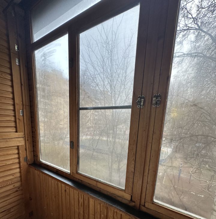 Балкон застеклен, с видом на зеленый двор.