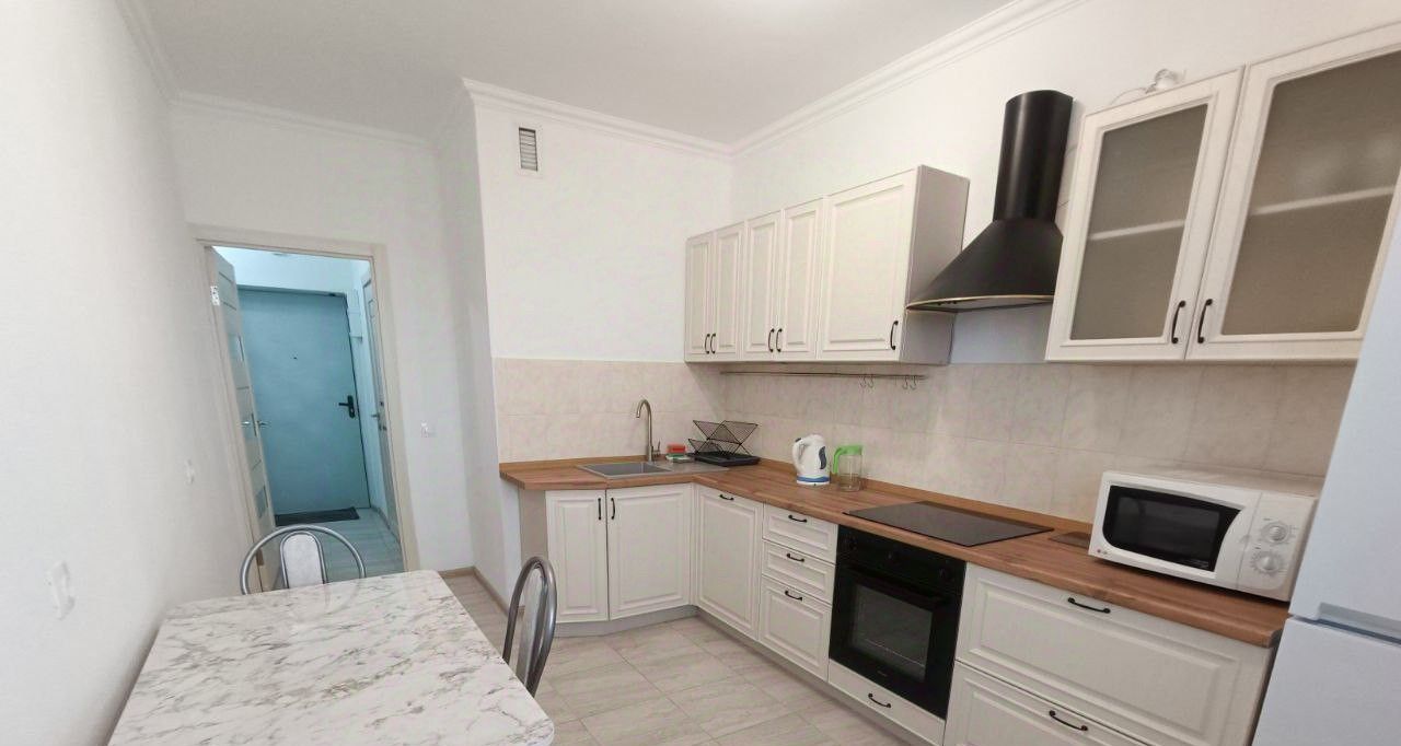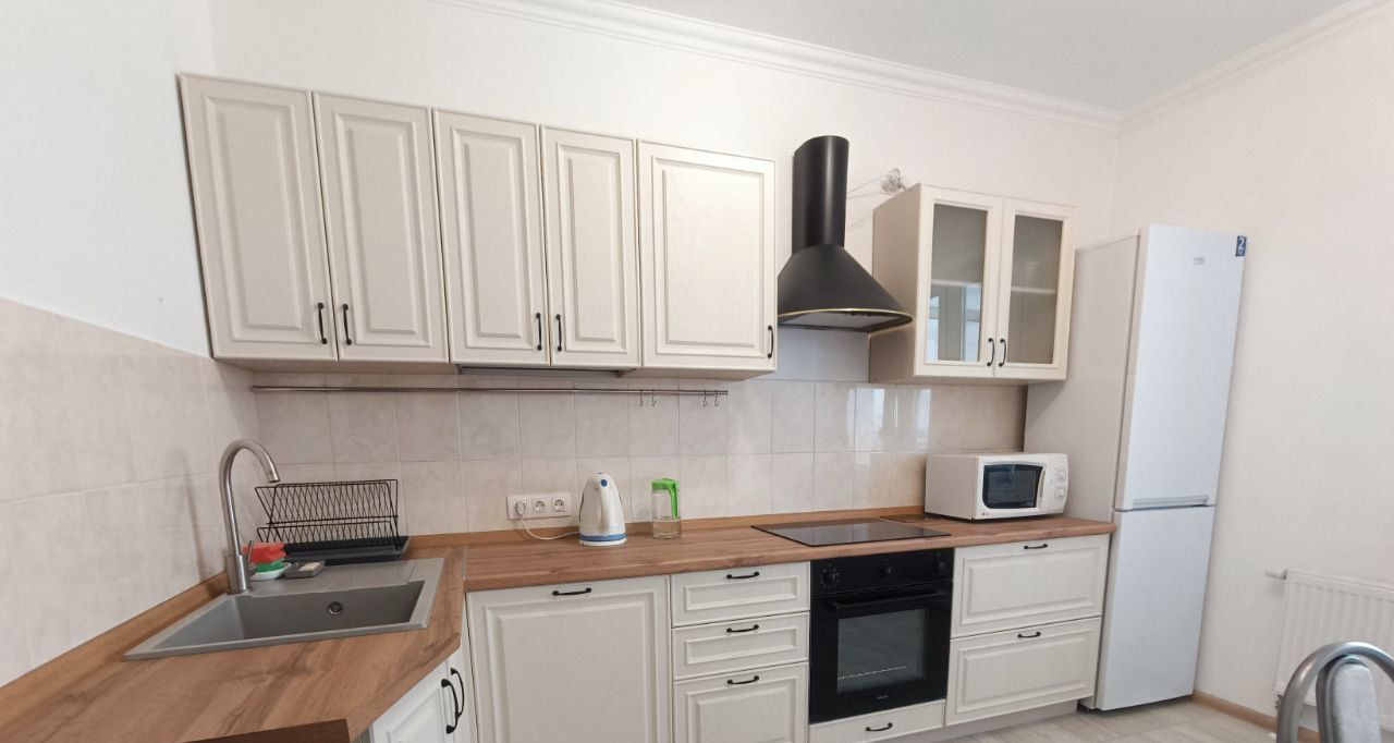 Есть вся необходимая мебель и техника. Встроенный кухонный гар-р, холодильник, варочная панель, духовой шкаф, вытяжка, микроволновая печь, обеденная зона (стол и стулья). Выход на лоджию из кухни.