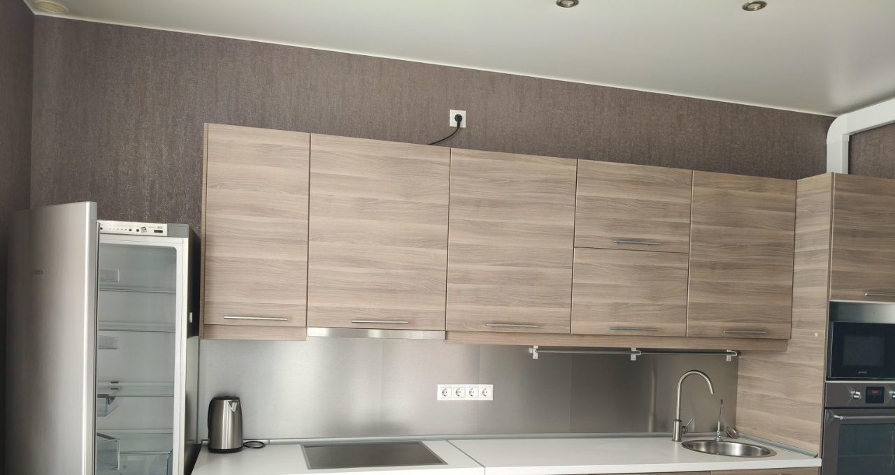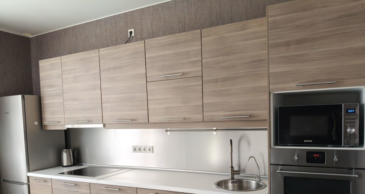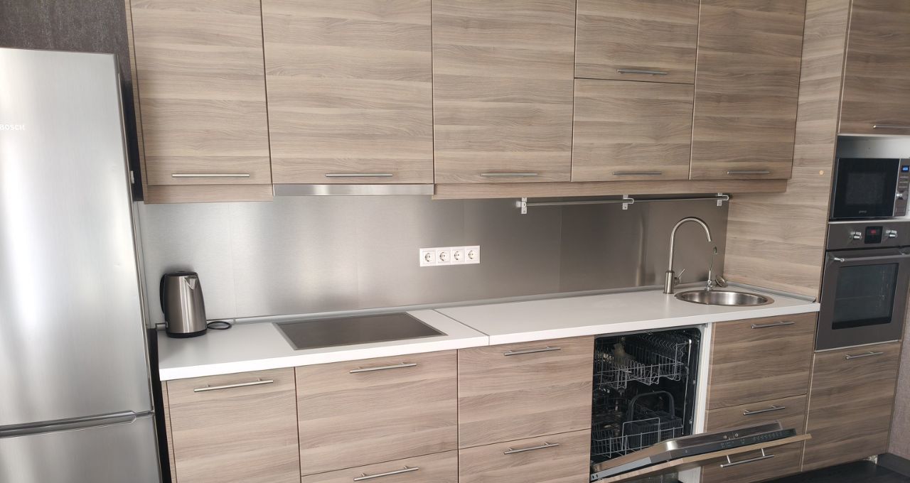 Встроенный кухонный гарнитур, ПММ, холодильник, микроволновая печь, духовой шкаф.