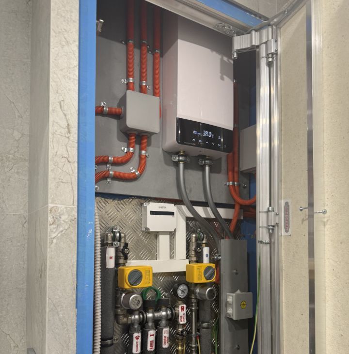 подогревы полов в ванной, коридоре и балконе, проточный водонагреватель и проточный фильтр.