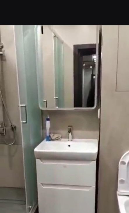 Ванная комната светлая в светлой плитке до потолка.Установлена душевая кабина.С/у совмещен.