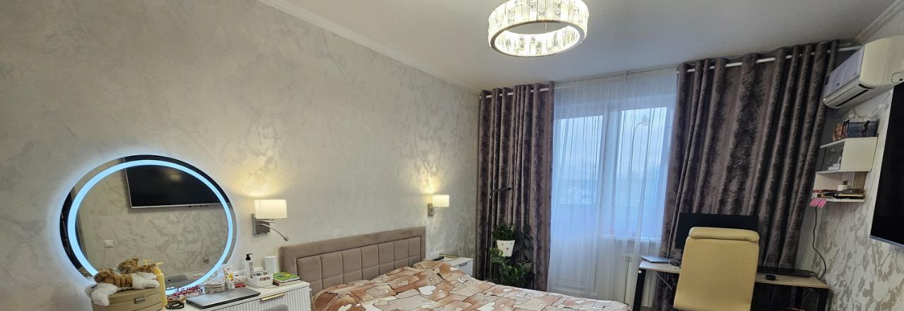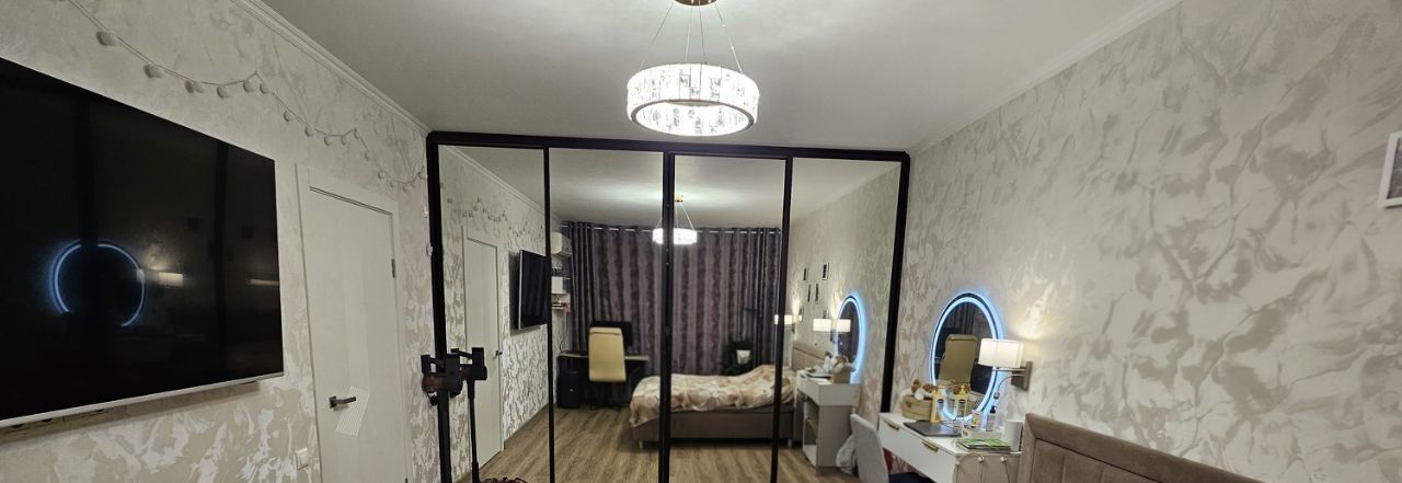 Спальня: большая кровать с ортопедическим матрасом, парящие тумбы, косметический столик с огромным зеркалом, зеркальный шкаф купе во всю стену.