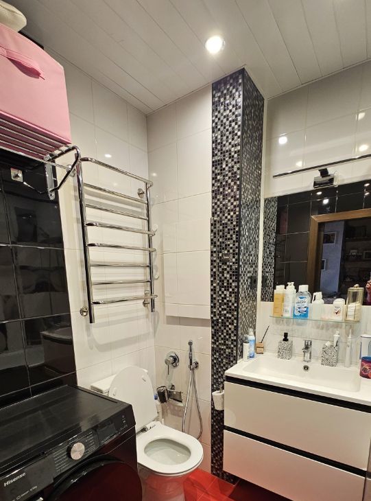 Ванная комната: новая сантехника, стиральная машина с сушкой, электрический полотенцесушитель.