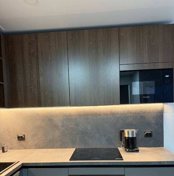 Кухня: встроенный холодильник и посудомоечная машина Beko, варочная панель, духовка и микроволновка Bosch.