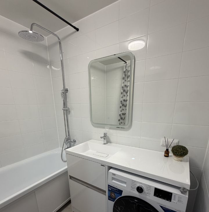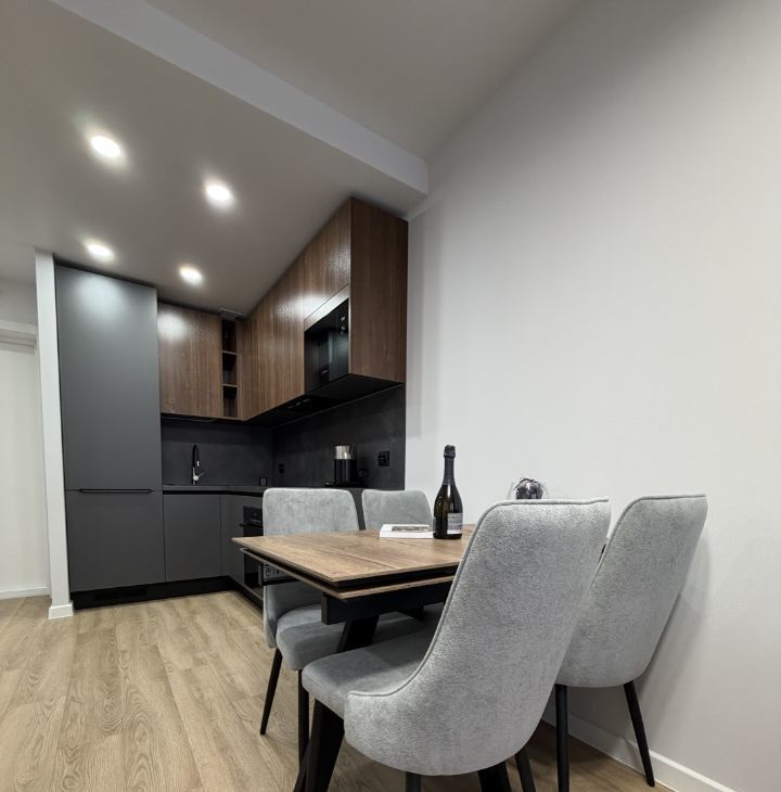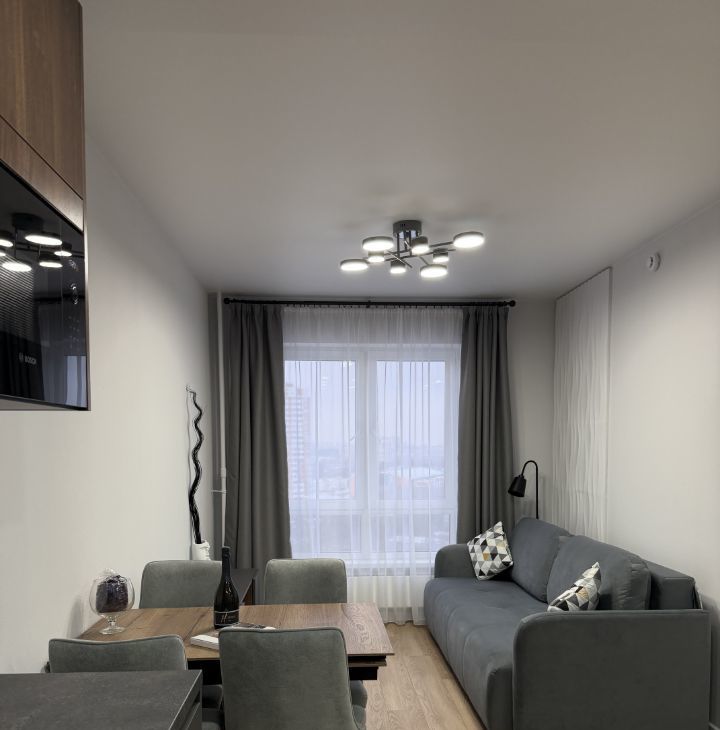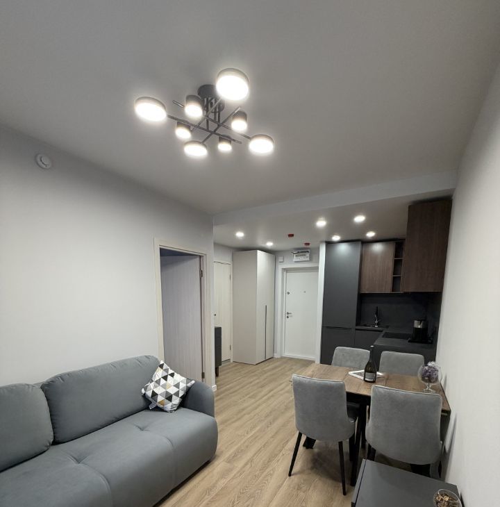 Общая площадь 32 кв.м, изолированная спальня, просторная кухня-гостиная.