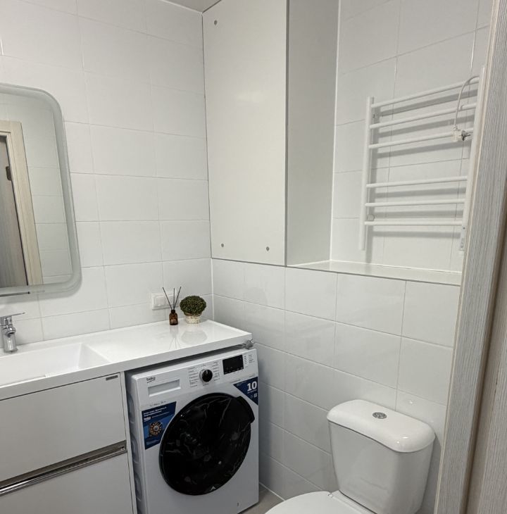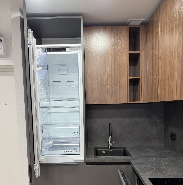 Кухня: встроенный холодильник и посудомоечная машина Beko, варочная панель, духовка и микроволновка Bosch. Стиральная машина Beko.