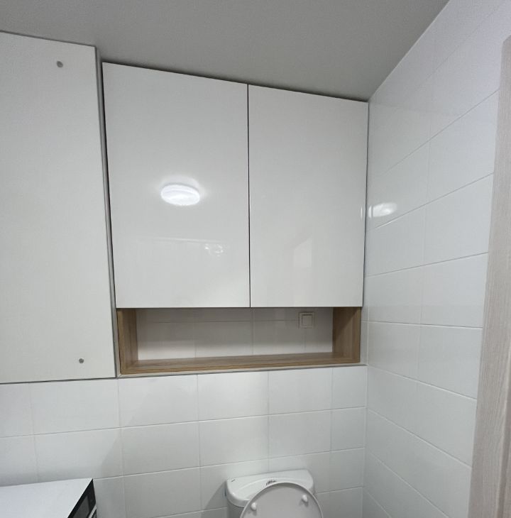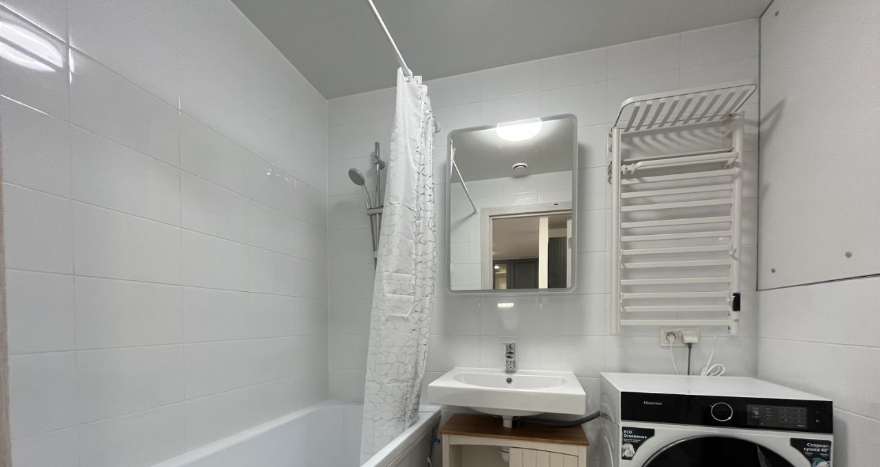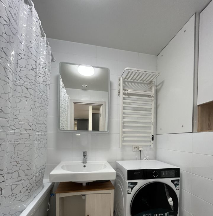 Санузел: стиральная машина с функцией сушки, электрический полотенцесушитель, вместительный шкафчик в нише и плюс под раковиной и ванной. Зеркало с подсветкой и шкафчиком.