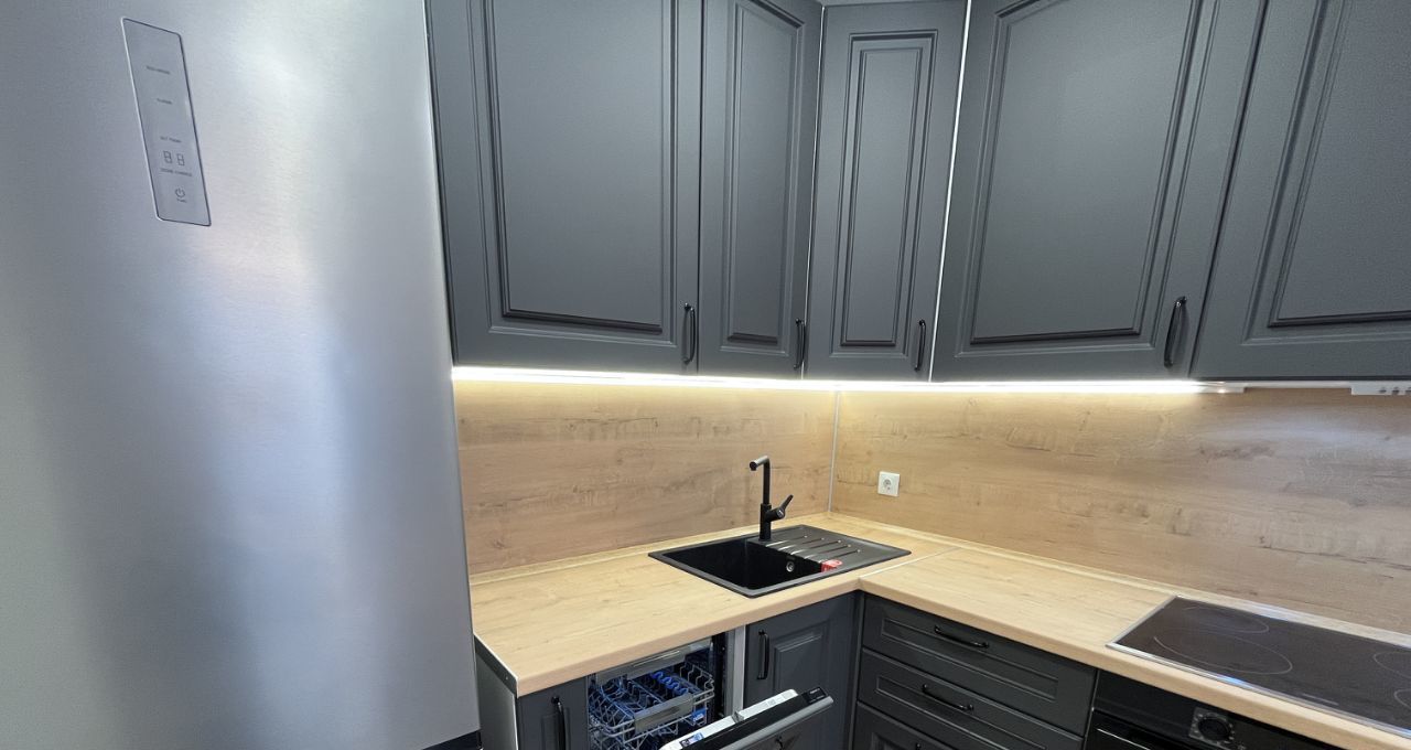 Кухня: холодильник, посудомоечная машина, духовка, варочная панель, вытяжка, микроволновая печь.
