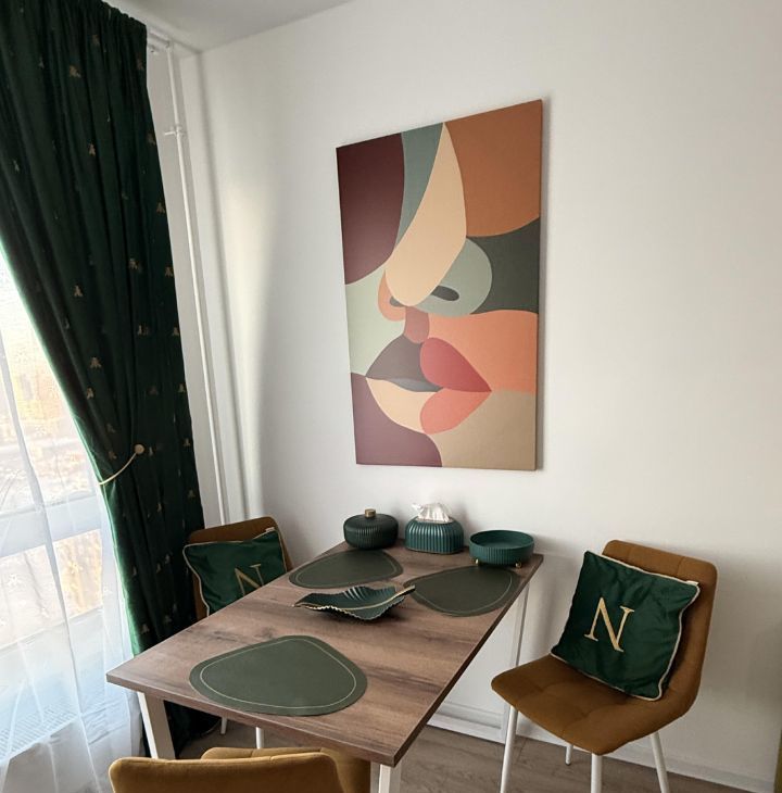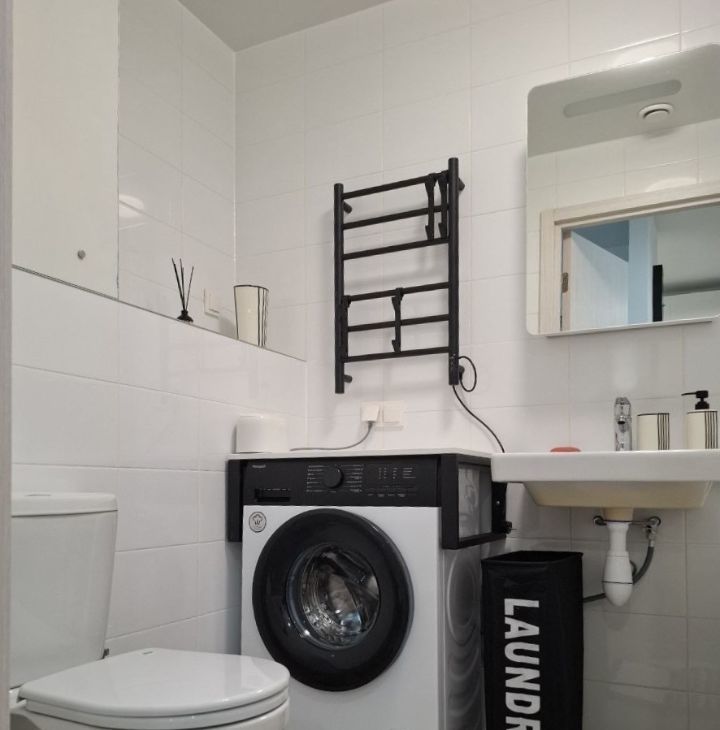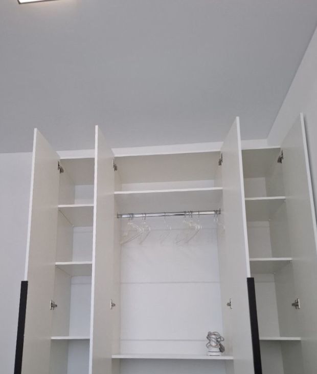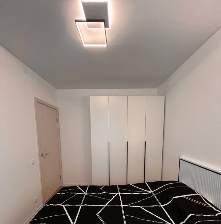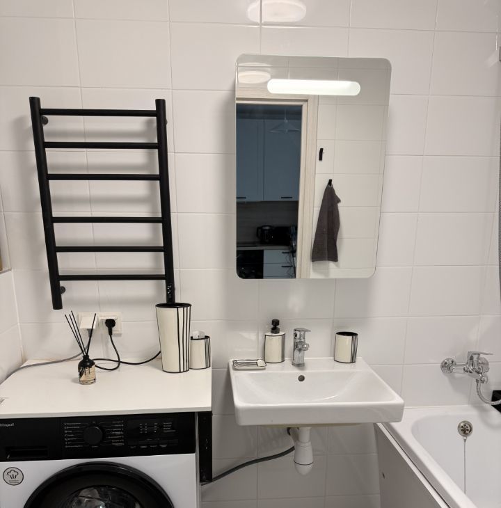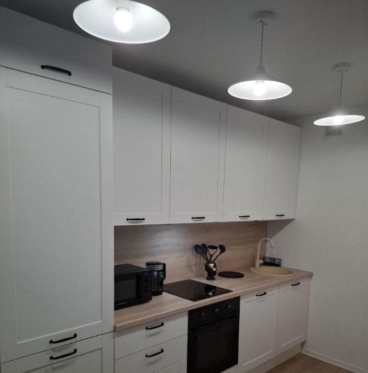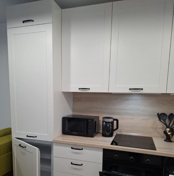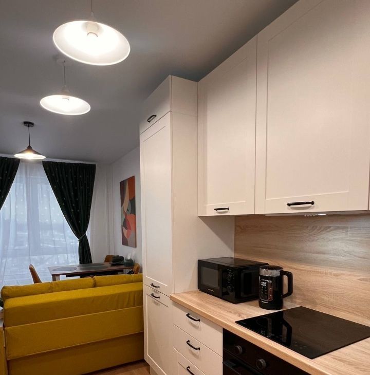 Светлая, с новой мебелью и техникой, просторная кровать с ортопедическим матрасом 22 см, кухня из МДФ со встроенной техникой (вытяжка, варочная панель с тремя конфорками, посудомоечная машина ширина 60 см, духовой шкаф, вместительный холодильник), большой телевизор со Smart-Tv, удобный обеденный стол раздвижной для Вас и Ваших друзей, диван в кухне-гостиной раскладной.