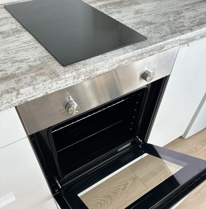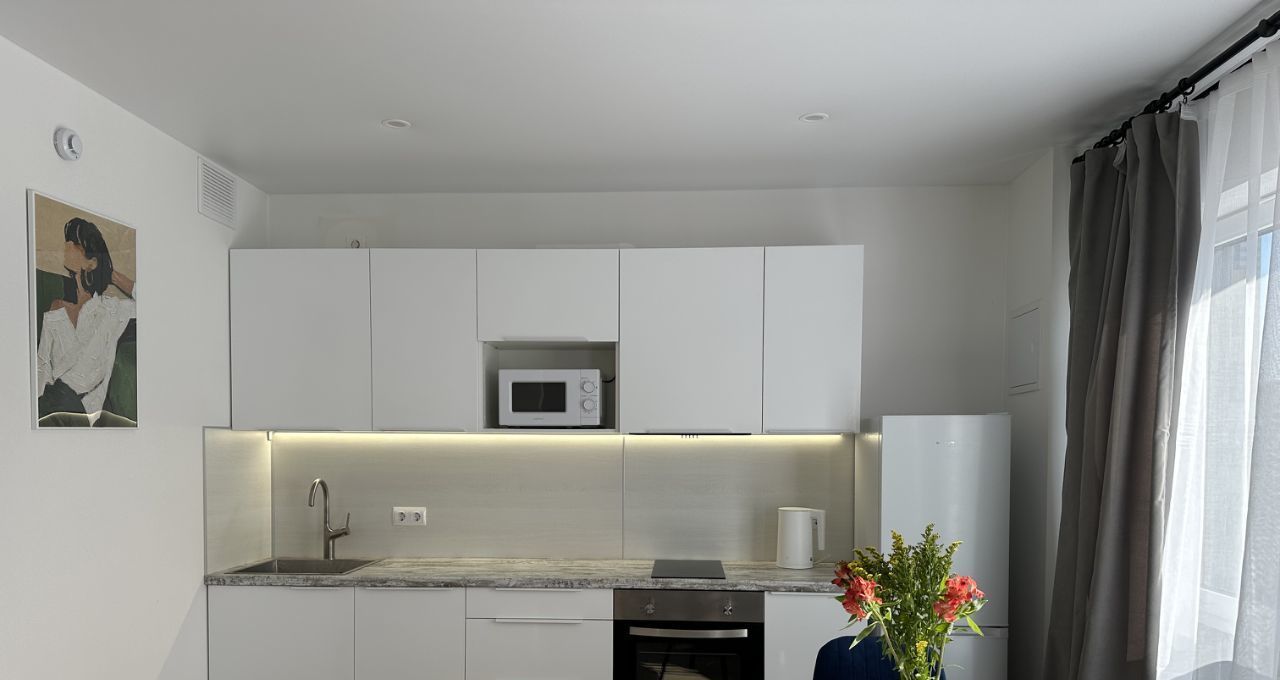 - продуманная кухня с подсветкой: духовой шкаф, варочная панель, вытяжка, холодильник, чайник;