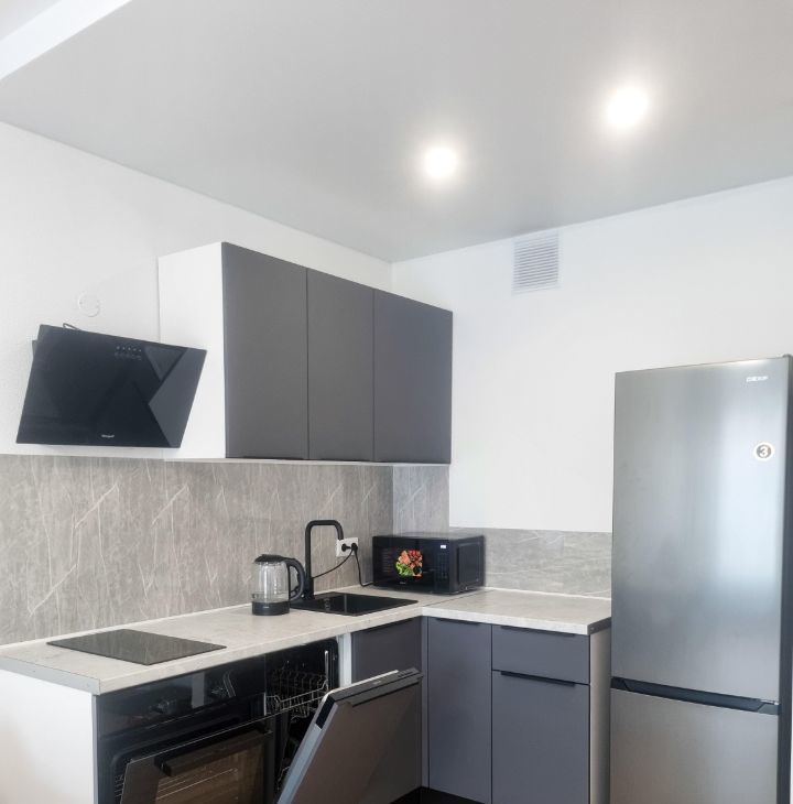 Зона кухни - кухонный гарнитур со встроенной посудомоечной машиной, полноценным духовым шкафом и варочной панелью. Для быстрого разогрева пищи - СВЧ. Большой 2-х камерный холодильник. Мощная вытяжка, которая помогает избежать запахов еды при готовке.