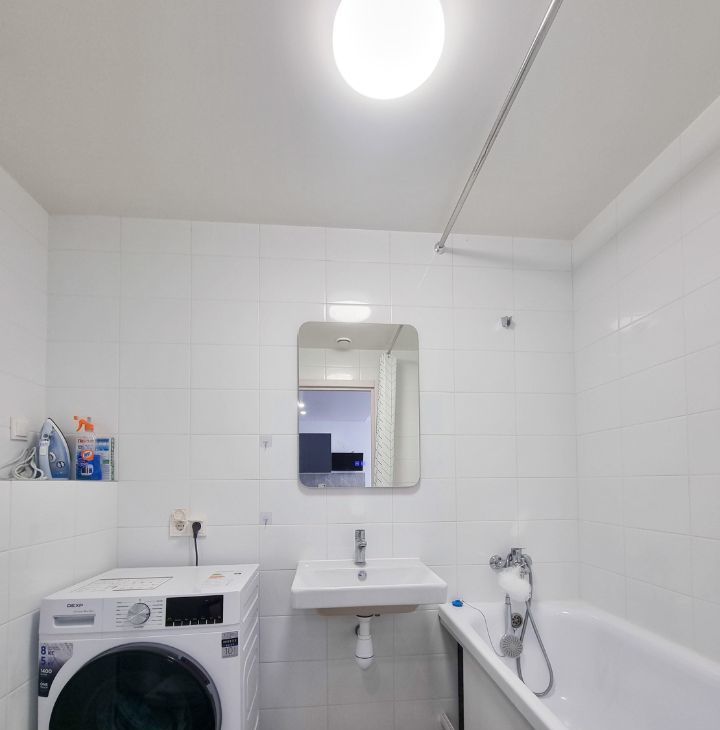Санузел оборудован ванной. Стиральная машинка со встроенной функцией сушки.