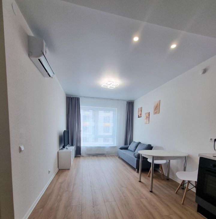 В кухне-гостинной диван-кровать, телевизор, тумба под ТВ и кондиционер.