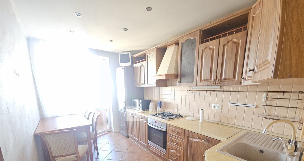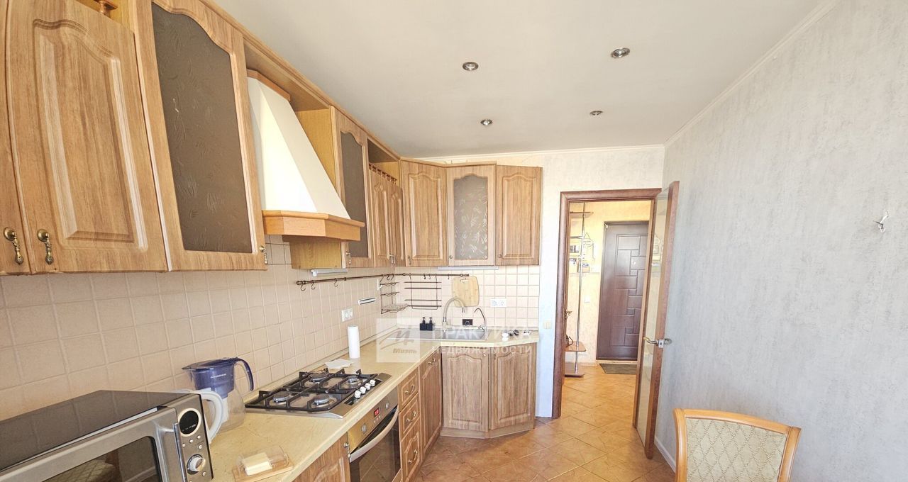 Большая кухня 10 кв.м., оборудована всей необходимой техникой и мебельным кухонным гарнитуром из натурального дерева. Из кухни Вы попадаете на застекленный балкон с потрясающим видом, где вы сможете расслабиться и насладиться видами на тихий городской пейзаж.