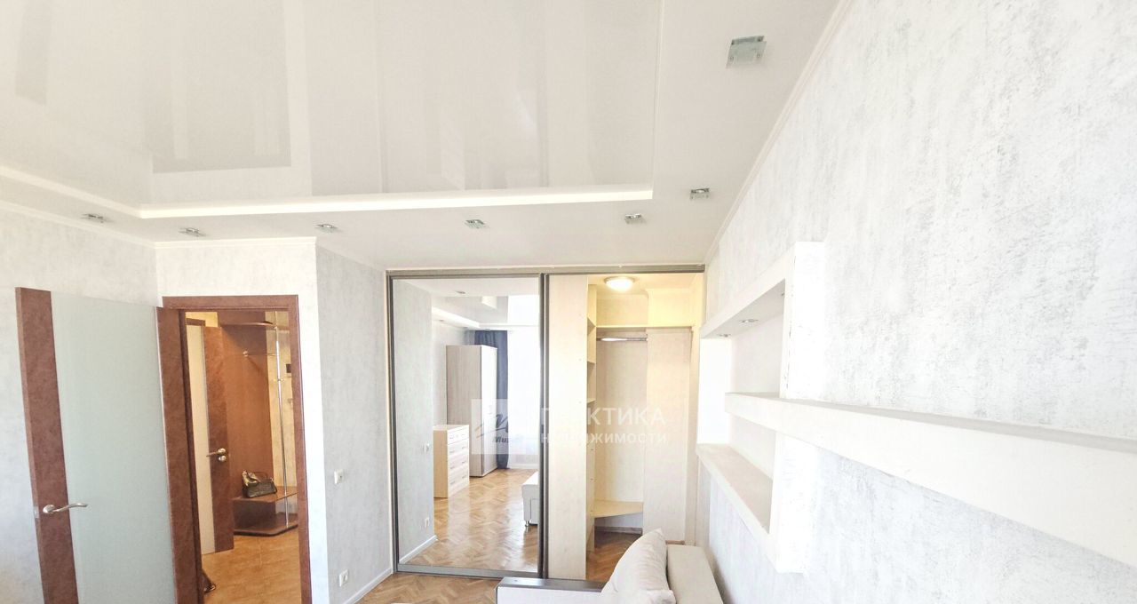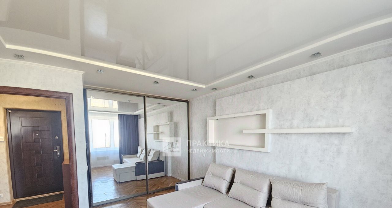 Просторные комната 20 кв.м., есть спальное место большой раскладной диван. В нише комнаты помещен зеркальный шкаф-купе, который очень и очень вместительный и функциональный. На полу паркет, что дает теплоту и уют в комнате. Натяжные потолки с грамотно продуманным точечным освещением, которое придает комнате больше комфорта.
