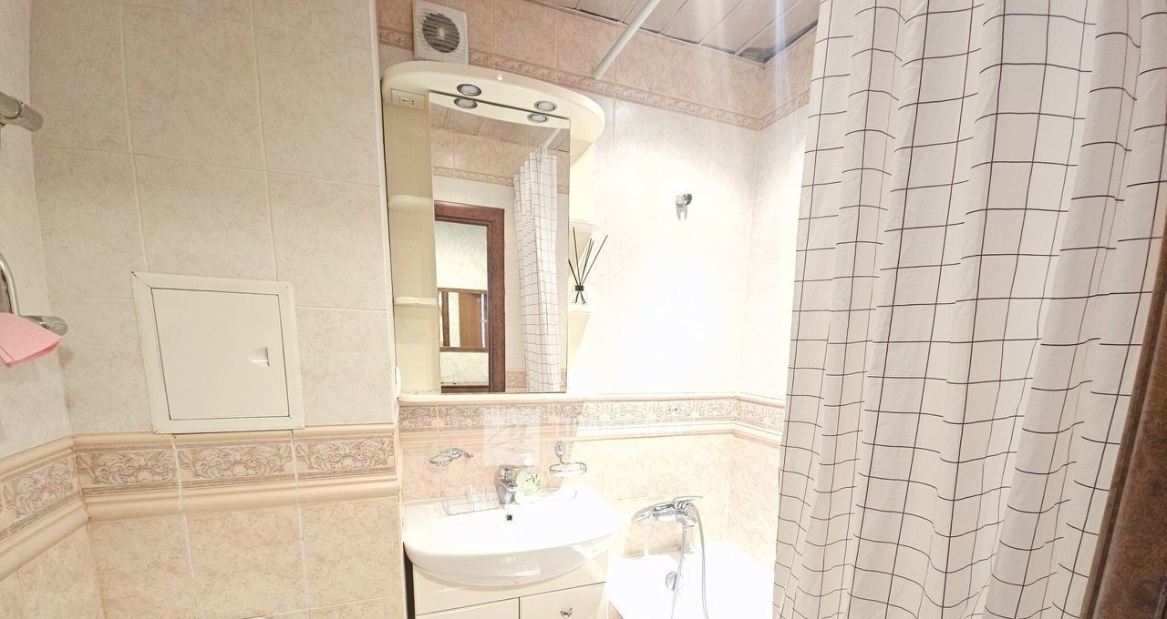 Совмещенный санузел с полноценной ванной и с идеально чистой, ухоженной сантехникой.