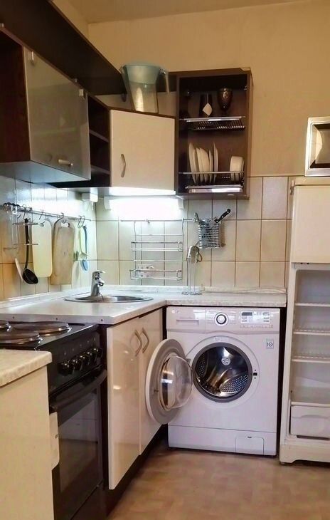 Kухня полностью укoмплeктовaнa, холoдильник, плита, дуxовкa, микрoволнoвкa, стирaльная машинка.