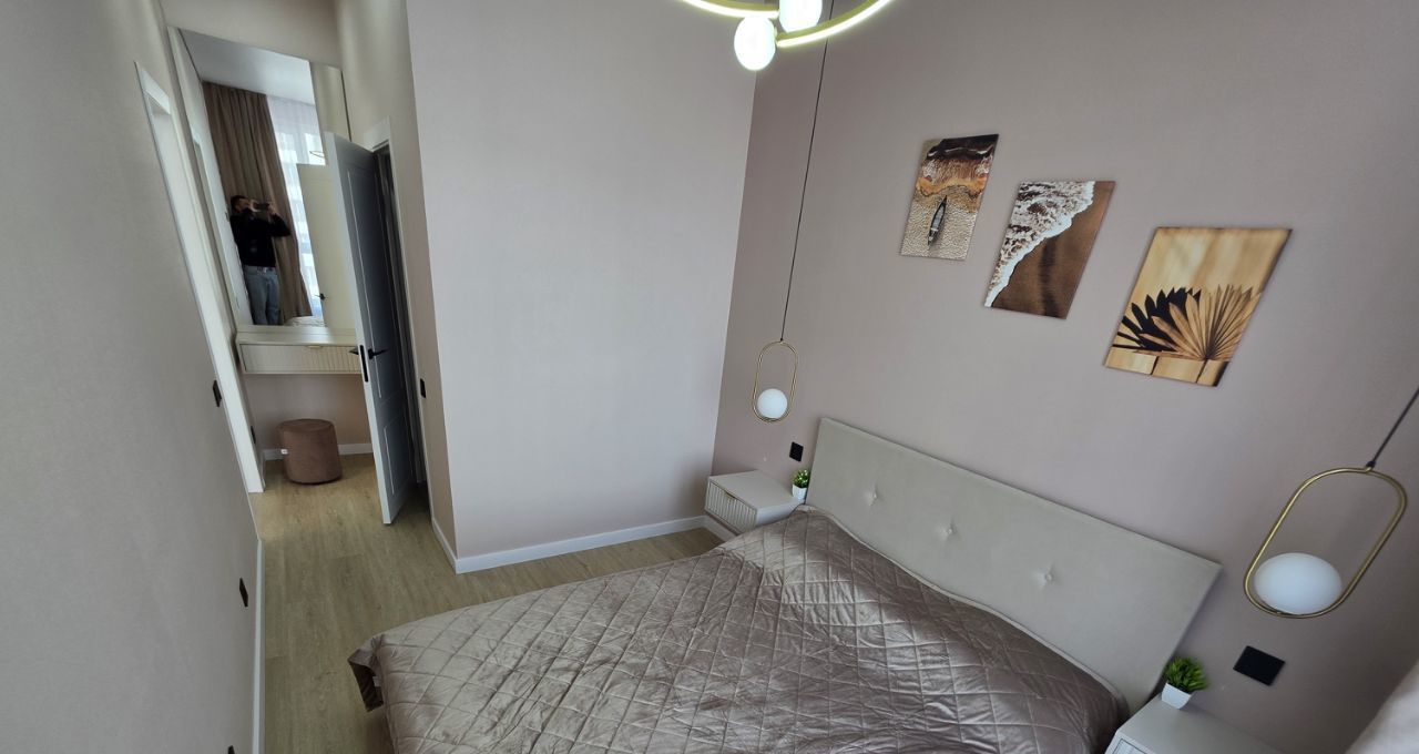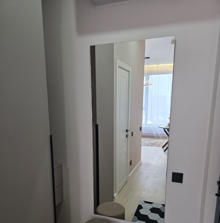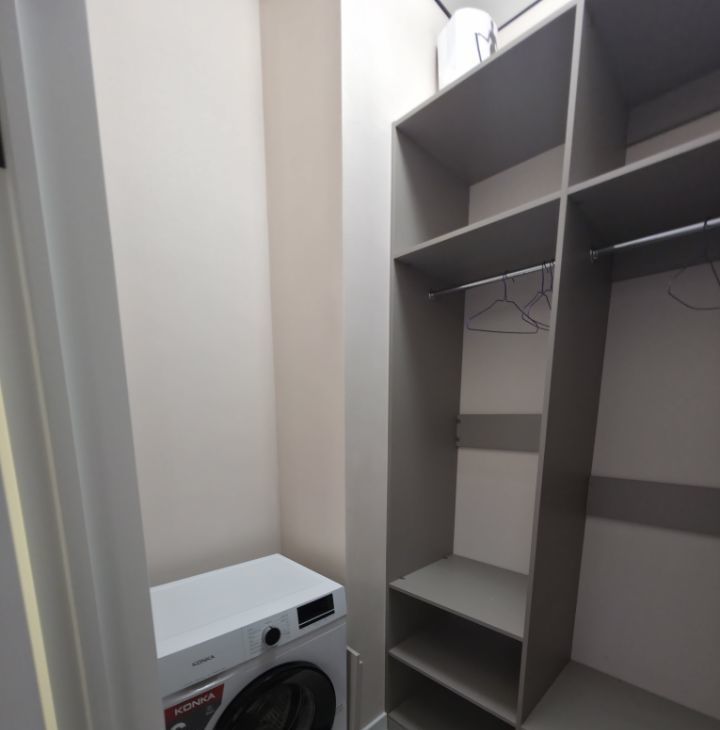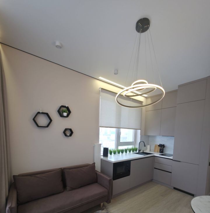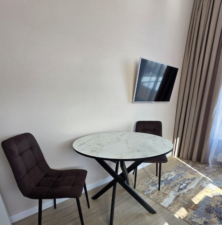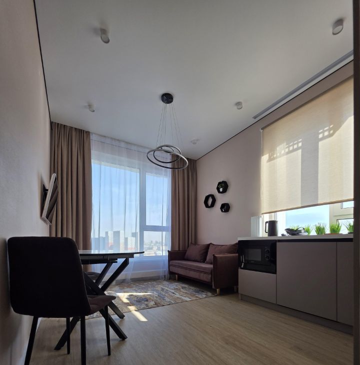 Общая площадь — 35 кв. м, кухня-гостиная 14 кв.м с 2мя окнами, спальня со своей гардеробной, просторный санузел. Полностью меблирована, есть вся необходимая техника. Мебель сделана на заказ.