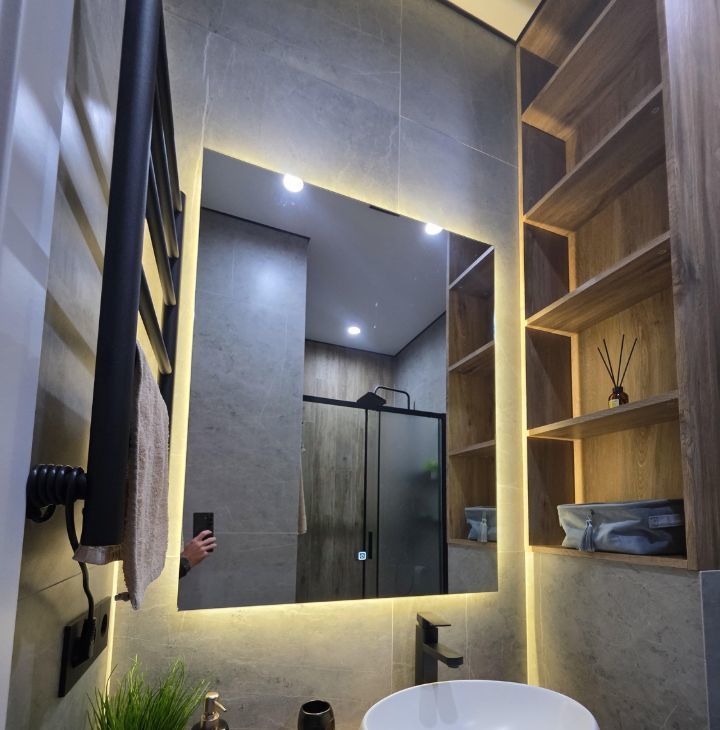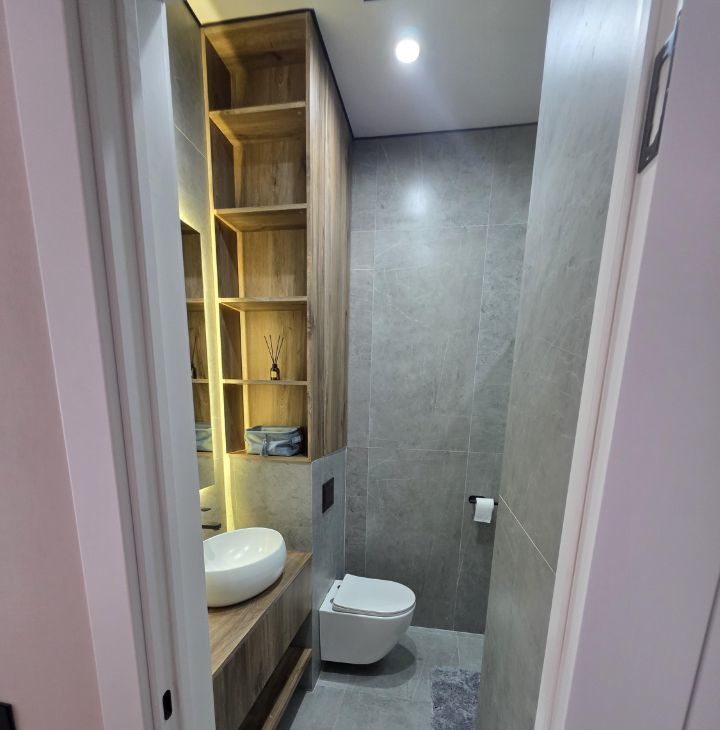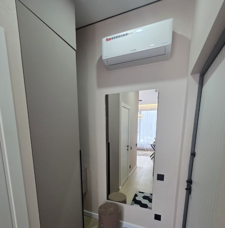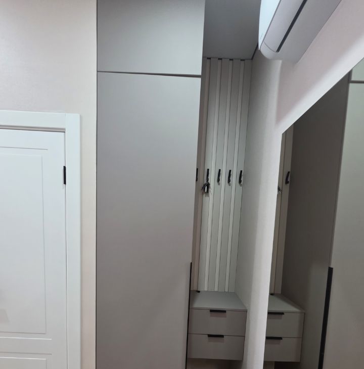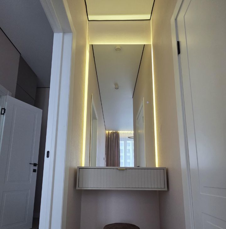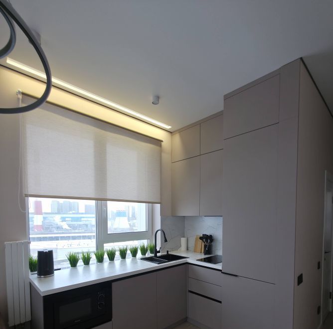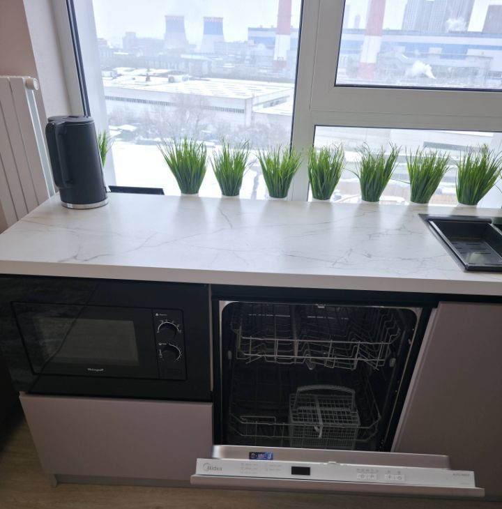 Общая площадь — 35 кв. м, кухня-гостиная 14 кв.м с 2мя окнами, спальня со своей гардеробной, просторный санузел. Полностью меблирована, есть вся необходимая техника. Мебель сделана на заказ.