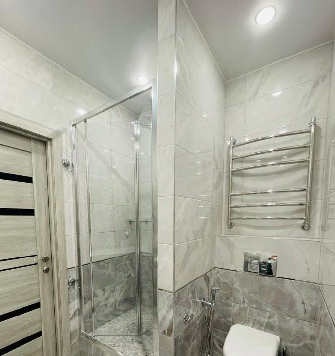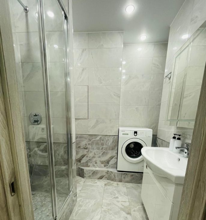 Санузел совмещенный с душевой кабиной, стиральной машиной, бойлером, гигиеническим душем, подогревом пола.