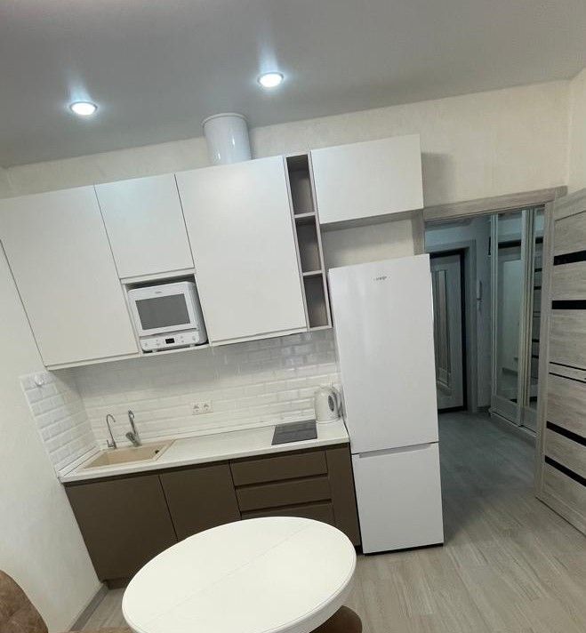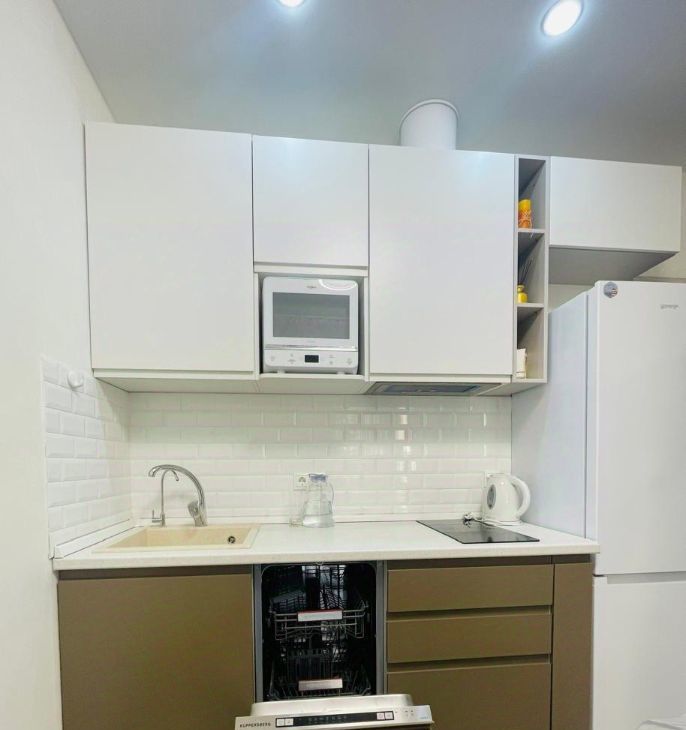 Кухня оснащена варочной панелью, вытяжкой, микроволновой печью, посудомоечной машиной, холодильником, электрическим чайником, системой фильтрации воды Гейзер и раскладывающимся диваном.