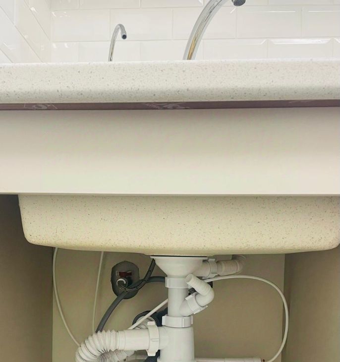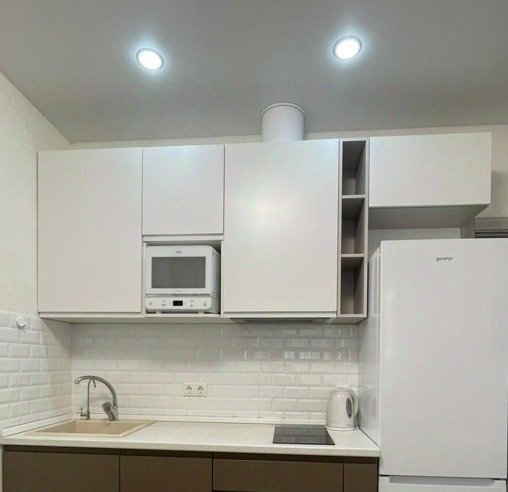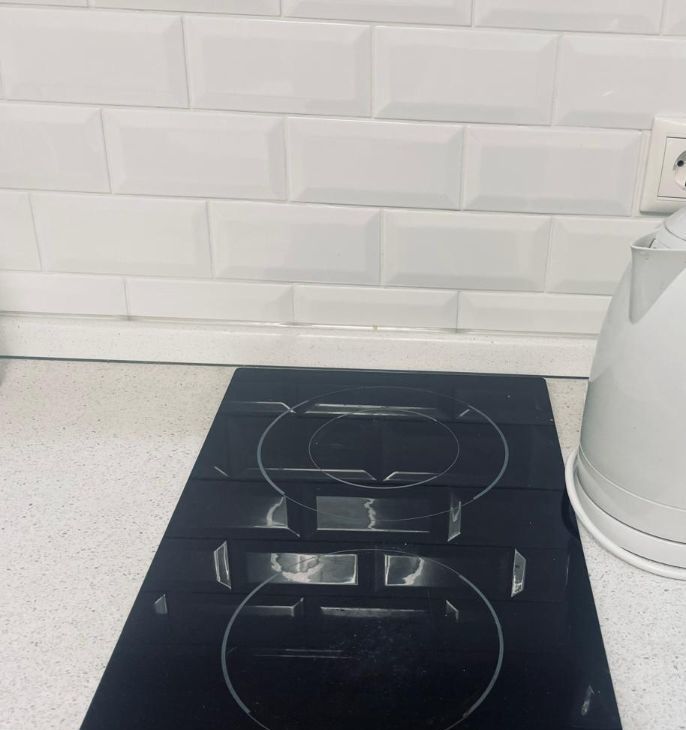 Кухня оснащена варочной панелью, вытяжкой, микроволновой печью, посудомоечной машиной, холодильником, электрическим чайником, системой фильтрации воды Гейзер и раскладывающимся диваном.