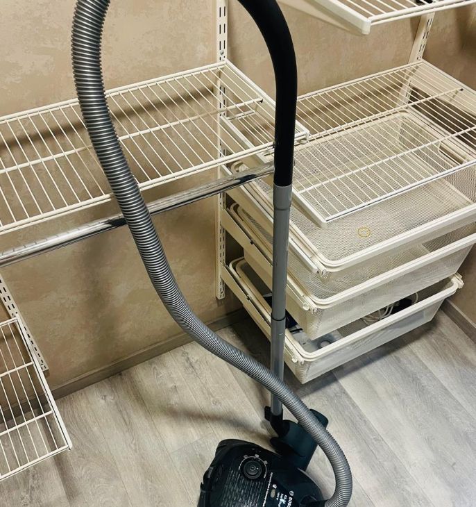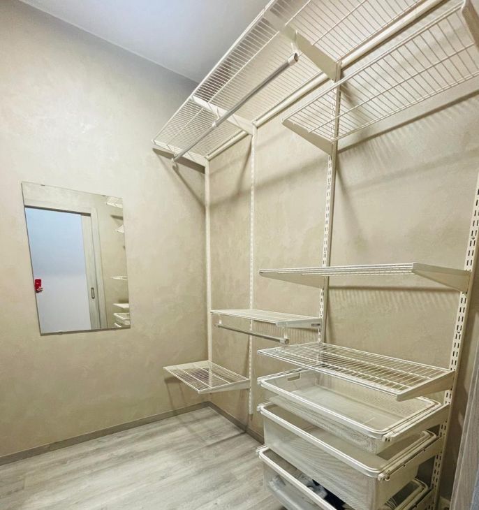 Гардеробная площадью 5,5 кв.м. с модульной системой хранения, гладильной доской, утюгом, напольной сушилкой, пылесосом и большим зеркалом.