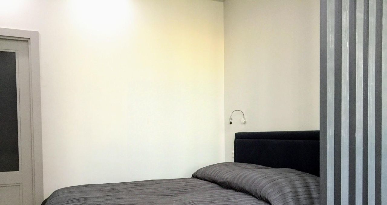 Планировка евродвушки, комната зонирована лёгкой перегородкой на гостиную с диваном и спальню с полноценной двуспальной кроватью. Просторная кухня, большой санузел, гардеробная комната. Много мест хранения. Полностью меблирована и оснащена техникой.