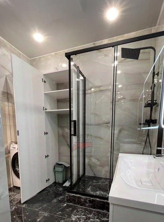 Ванная комната с душевой кабиной и качественной эстетичной сантехникой.