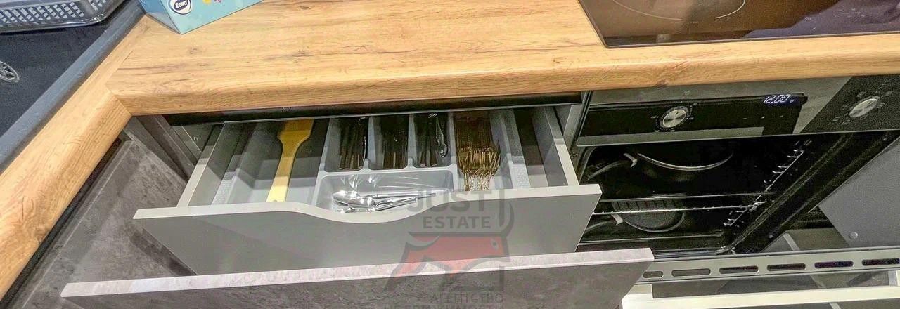 Функциональный современный кухонный гарнитур с встроенной варочной панелью, духовым шкафом, вытяжкой и посудомоечной машиной. Новый холодильник и микроволновая печь.