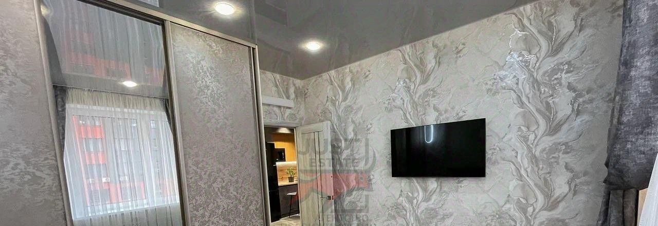 В спальне удобная и комфортная 2-х спальная кровать, шкаф-купе и телевизор.
