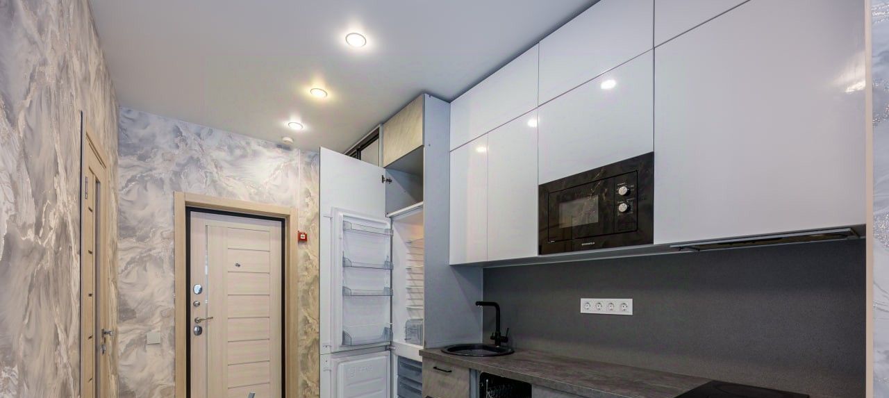 Качественный кухонный гарнитур с автоматическими кухонными шкафами оборудован встроенным холодильником и посудомоечной машиной, чтобы экономить Ваше время!)