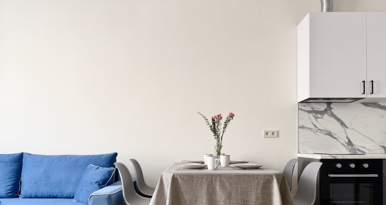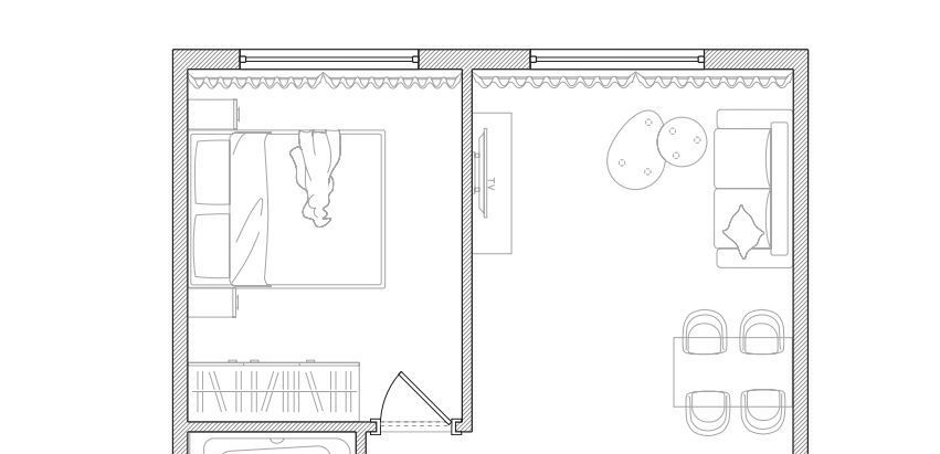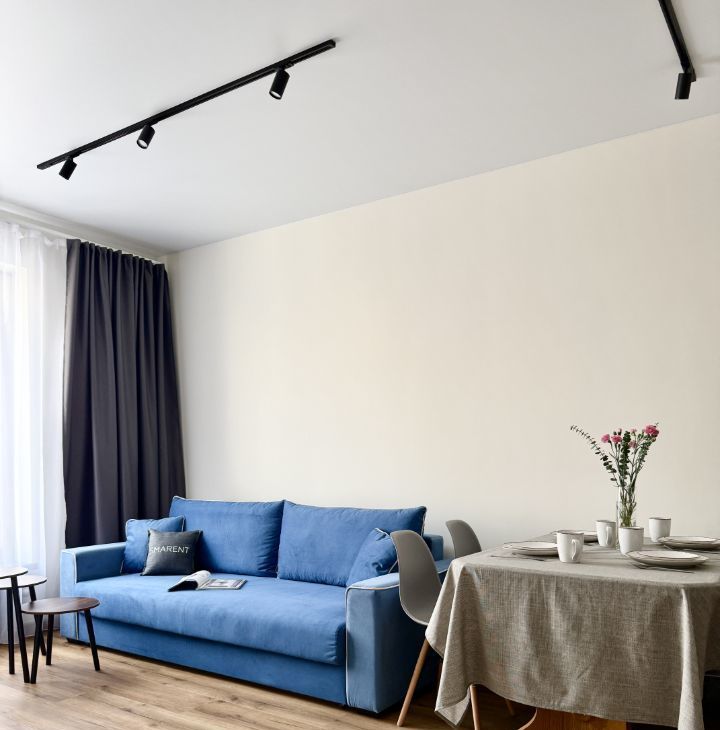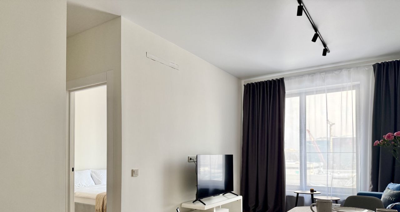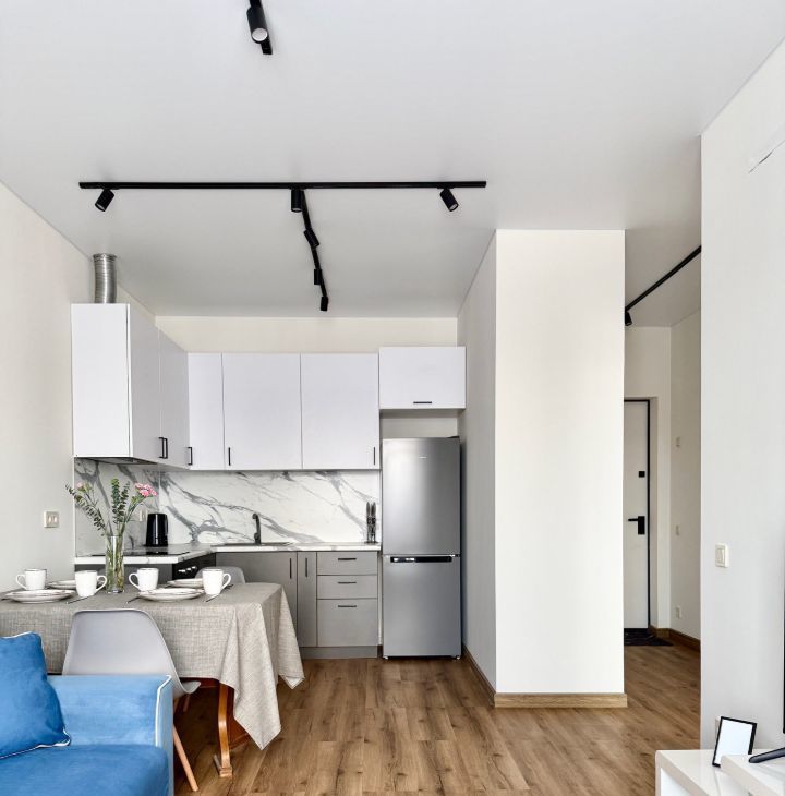 Meбeль: кухoнный гаpнитур со всей необходимой техникой, обеденный столик, кровать, раскладной диван, вместительный шкаф и прикроватный столик, который может быть использован как небольшое место для работы.