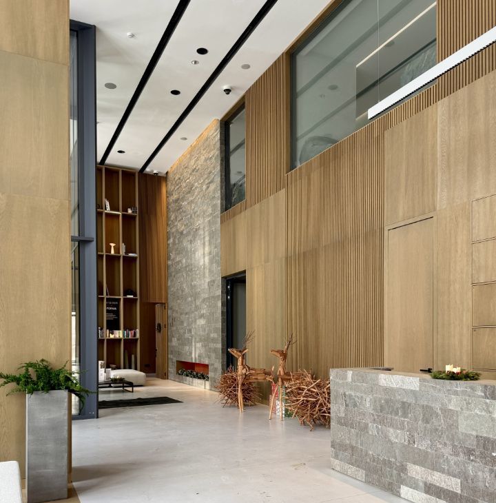 В лобби Forst от Forma продумана каждая деталь. Деловым людям здесь будет комфортно проводить встречи. Зона отдыха и камин, лекторий, лапомойка, библиотека, диваны, колясочная - всё это и многое другое вы найдёте здесь, на входе в ваш дом. Здесь же, на первом этаже расположено кафе.