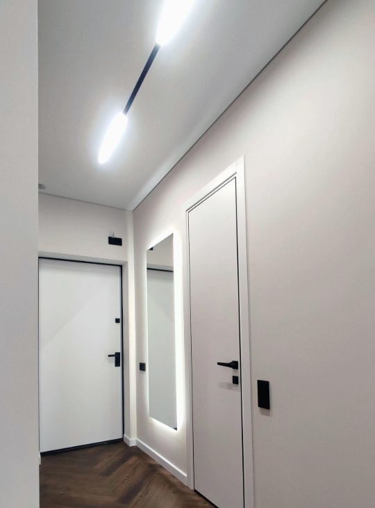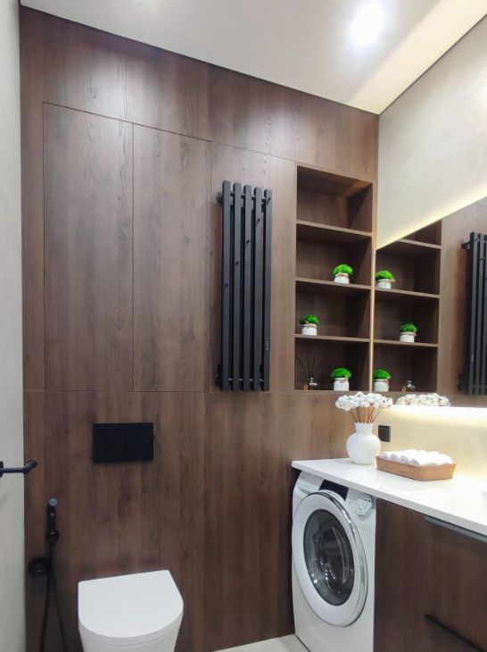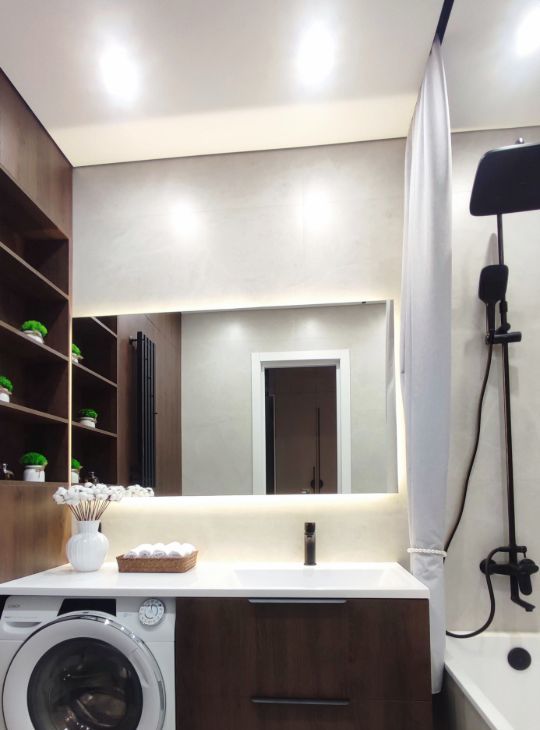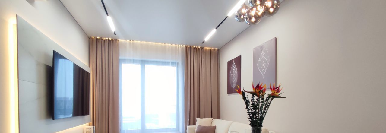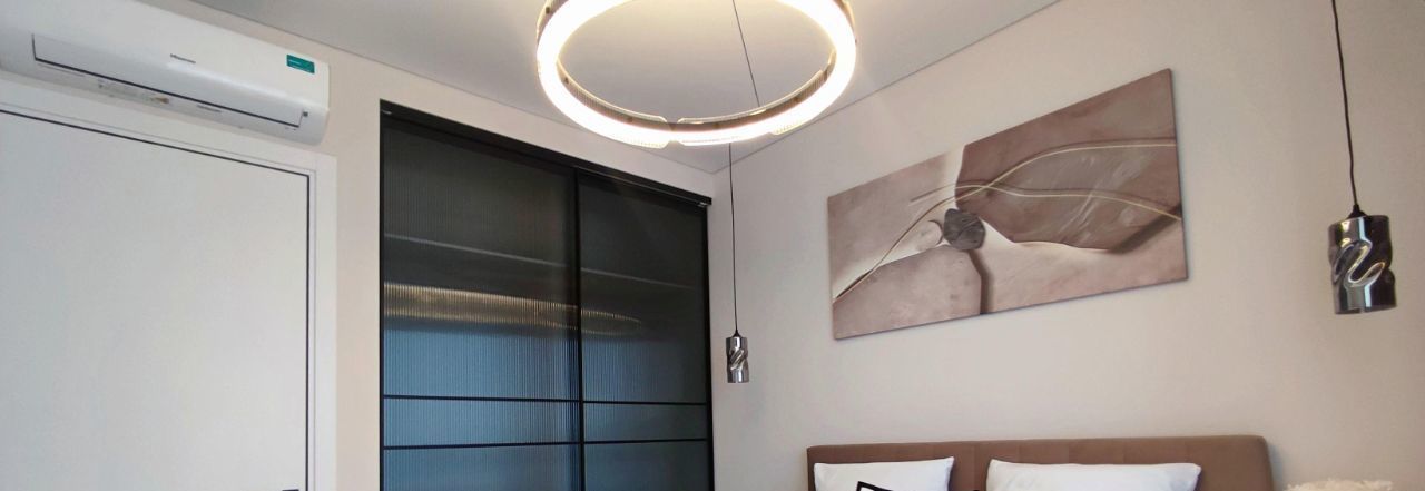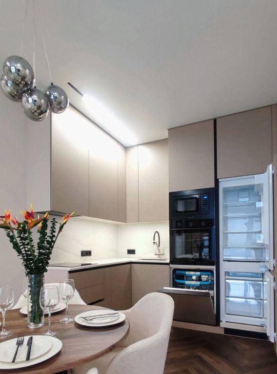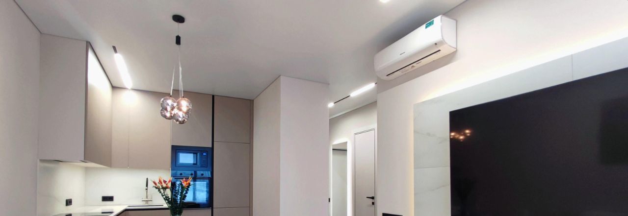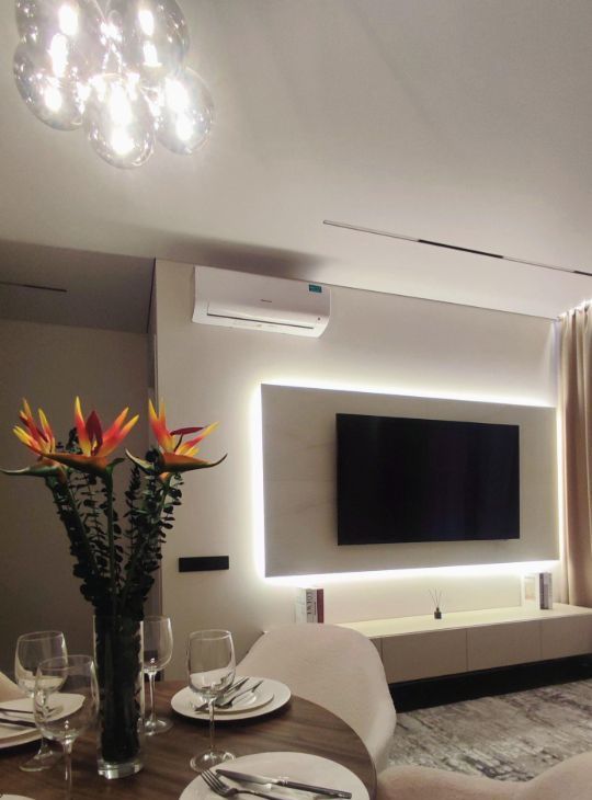 В квартире есть все необходимое: встроенная кухонная техника, телевизор, стиральная машина с функцией сушки, 2 кондиционера, 2 бризера, установлен проточный водонагреватель, фильтр питьевой воды и датчики протечки, теплый пол в санузле.