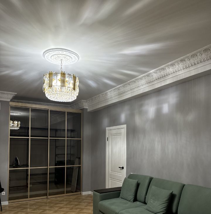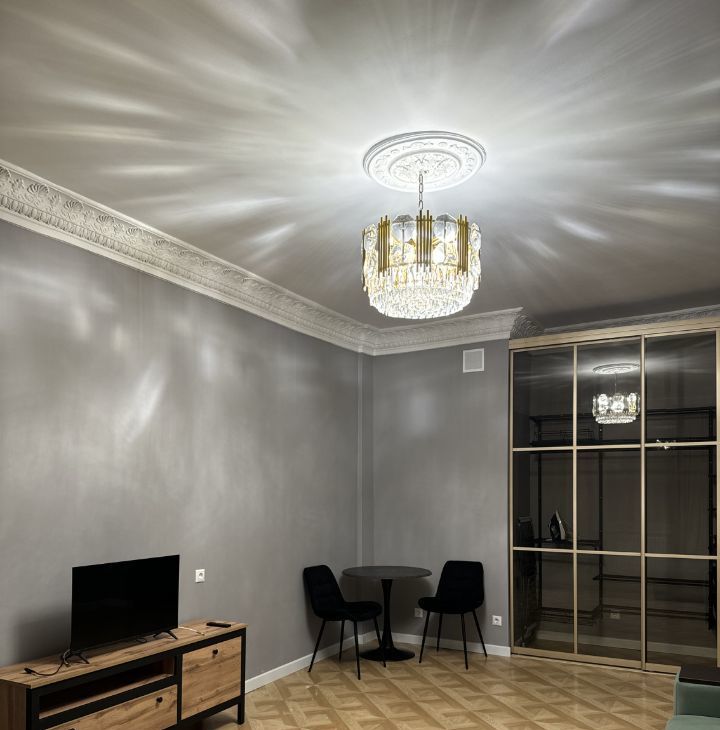 Квартира меблирована и оснащена бытовой техникой, сделан свежий дизайнерский ремонт, на кухне газовая плита. Спальню освещает шикарная люстра, создающая уютнейшую атмосферу. Интересное решение в виде стеклянной перегородки в гардеробную добавляет квартире шарм.
