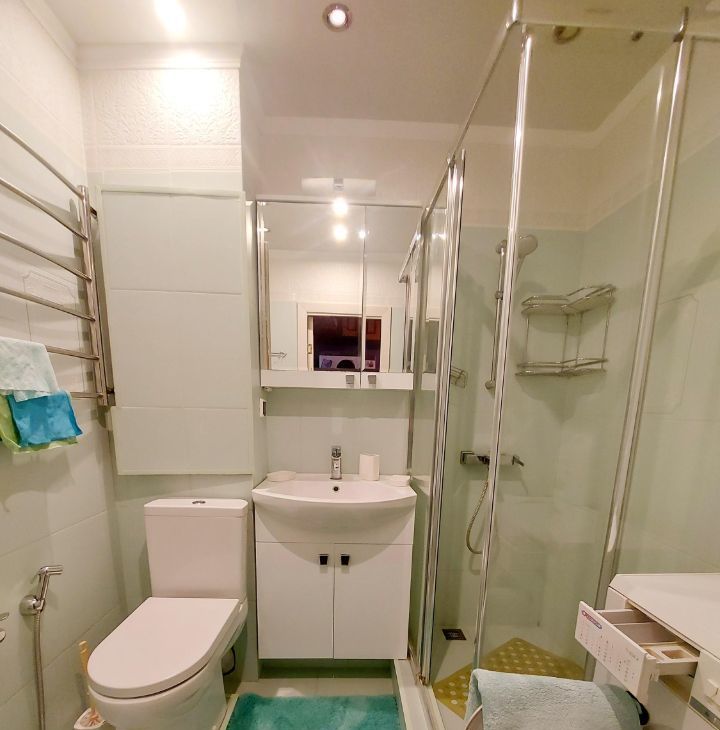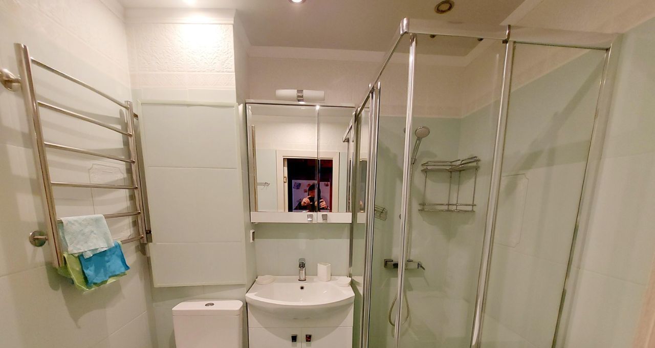 В квартире есть косметический ремонт, уютная обстановка и необходимая мебель на кухне и в комнате. Просторная кухня площадью 8.5 кв. м оснащена современными бытовыми приборами: холодильник, кондиционер, стиральная машина и телевизор. Ванная комната оборудована душевой кабиной. Высота потолков составляет 2.64 метра, а окна выходят во двор, поэтому в квартире всегда тихо и спокойно.