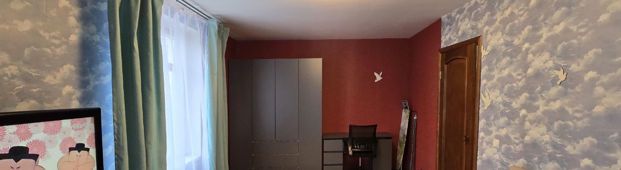 Жилая комната площадью 20,1 м² оборудована всей необходимой мебелью для комфортного проживания: двуспальная кровать (спальное место шириной 180 см), трёхстворчатый шкаф, комод, а также компьютерный стол с рабочим креслом.