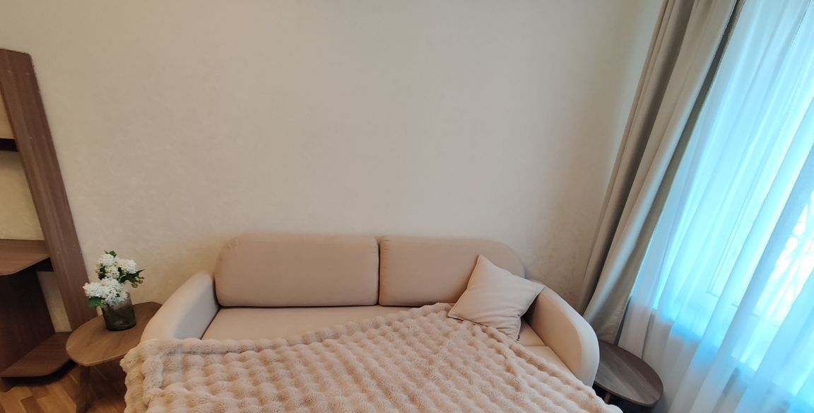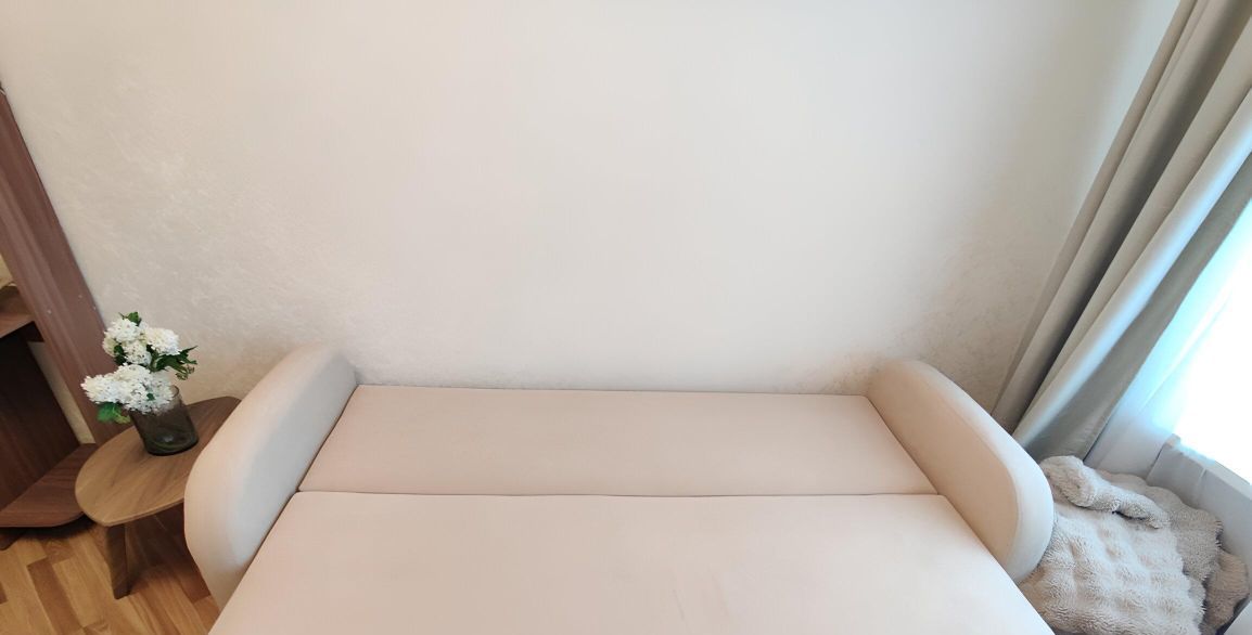 В комнате представлен абсолютно новый комфортный диван, который раскладывается в полноценное двуспальное место.