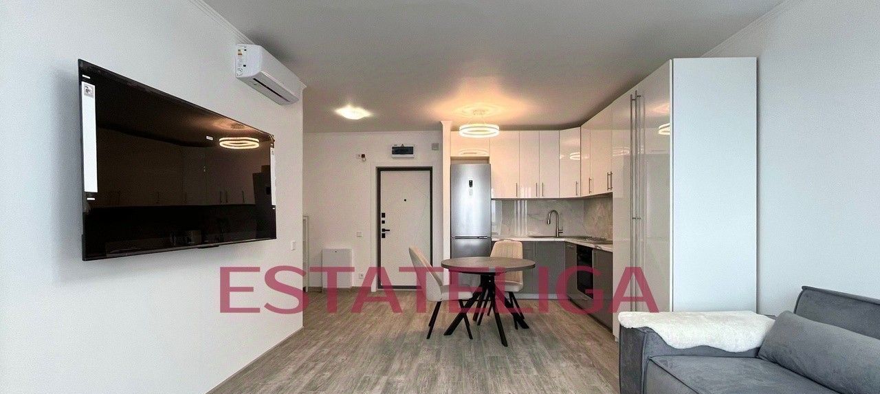 Функциональная планировка квартиры: просторная и светлая кухня-гостиная, изолированная спальная комната с двуспальной кроватью, совмещенный санузел с ванной.