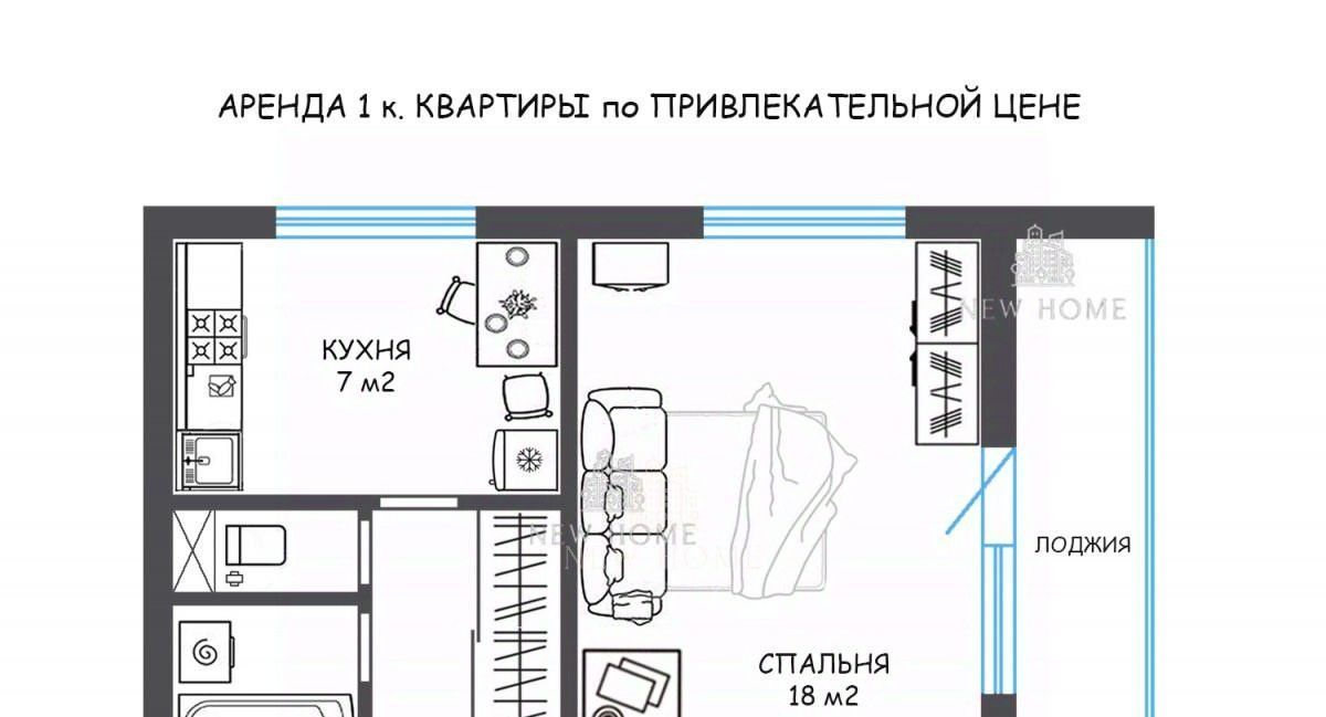 Комната 18 м2 с Большой Застекленной Лоджией 6 м2